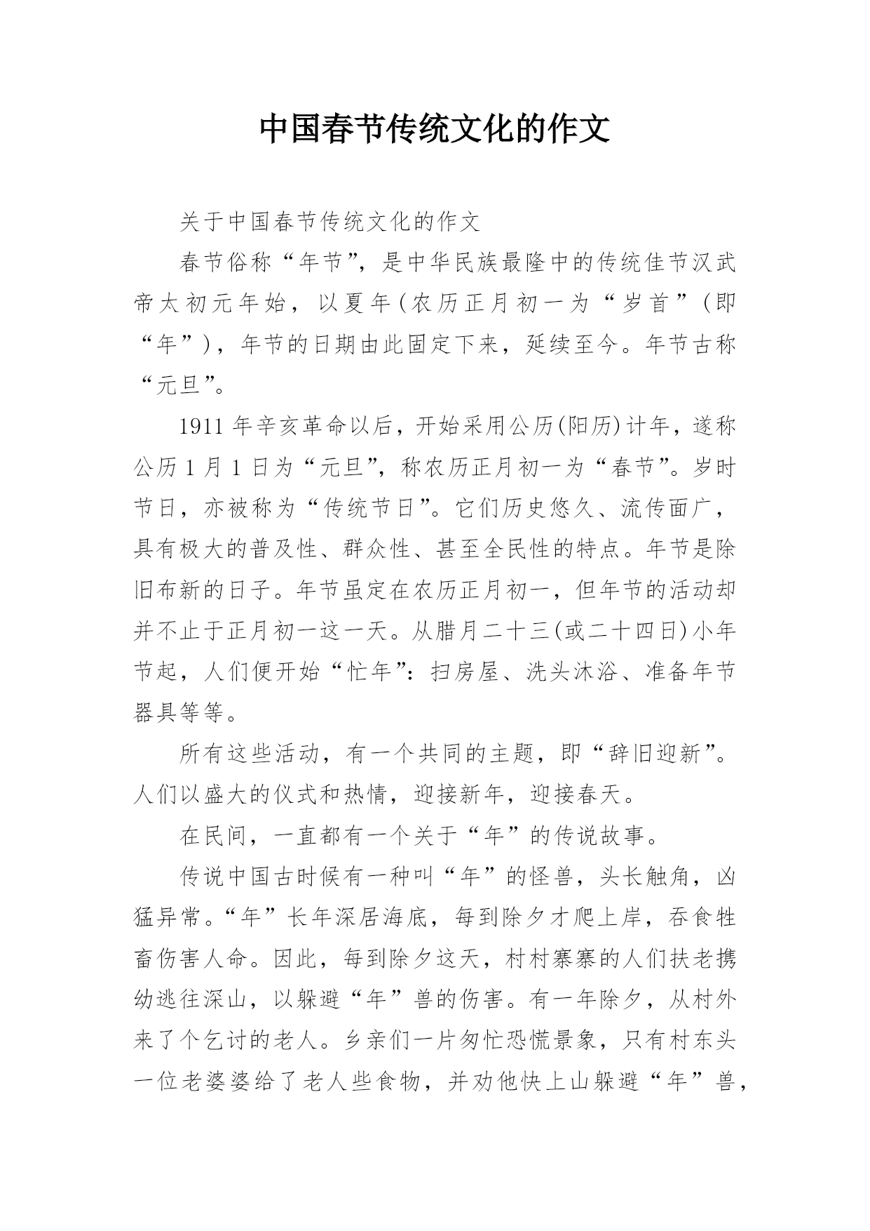 中国春节传统文化的作文关于中国春节传统文化的作文春节俗称“年节”,是中华民族最隆中的传统佳节汉武帝太初元年始,以夏年(农历正月初一为“岁首”(即“年”),年节的日期由此固定下来,延续至今。年节古称“元旦”。1911年辛亥革命以后,开始采用公历(阳历)计年,遂称公历1月1日为“元旦”,称农历正月初一为“春节”。岁时节日,亦被称为“传统节日”。它们历史悠久、流传面广,具有极大的普及性、群众性、甚至全民性的特点。年节是除旧布新的日子。年节虽定在农历正月初一,但年节的活动却并不止于正月初一这一天。从腊月二十三(或