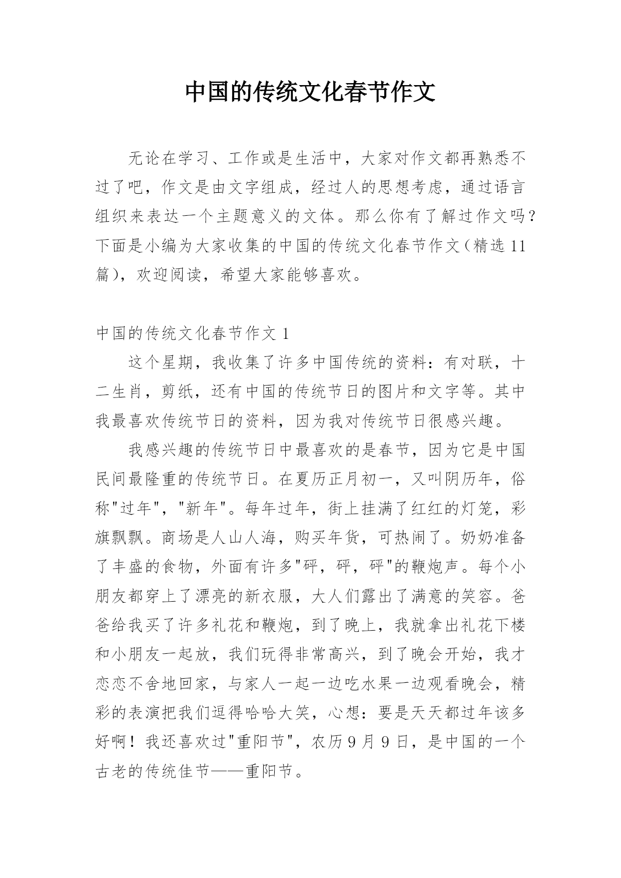 中国的传统文化春节作文无论在学习、工作或是生活中,大家对作文都再熟悉不过了吧,作文是由文字组成,经过人的思想考虑,通过语言组织来表达一个主题意义的文体。那么你有了解过作文吗?下面是小编为大家收集的中国的传统文化春节作文(精选11篇),欢迎阅读,希望大家能够喜欢。中国的传统文化春节作文1这个星期,我收集了许多中国传统的资料:有对联,十二生肖,剪纸,还有中国的传统节日的图片和文字等。其中我最喜欢传统节日的资料,因为我对传统节日很感兴趣。我感兴趣的传统节日中最喜欢的是春节,因为它是中国民间最隆重的传统节日。在夏