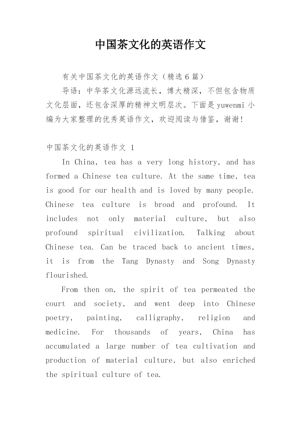 中国茶文化的英语作文有关中国茶文化的英语作文(精选6篇)导语:中华茶文化源远流长,博大精深,不但包含物质文化层面,还包含深厚的精神文明层次。下面是yuwenmi小编为大家整理的优秀英语作文,欢迎阅读与借鉴,谢谢!中国茶文化的英语作文1InChina,teahasaverylonghistory,andhasformedaChineseteaculture.Atthesametime,teaisgoodforourhealthandislovedbymanypeople.Chineseteaculturei