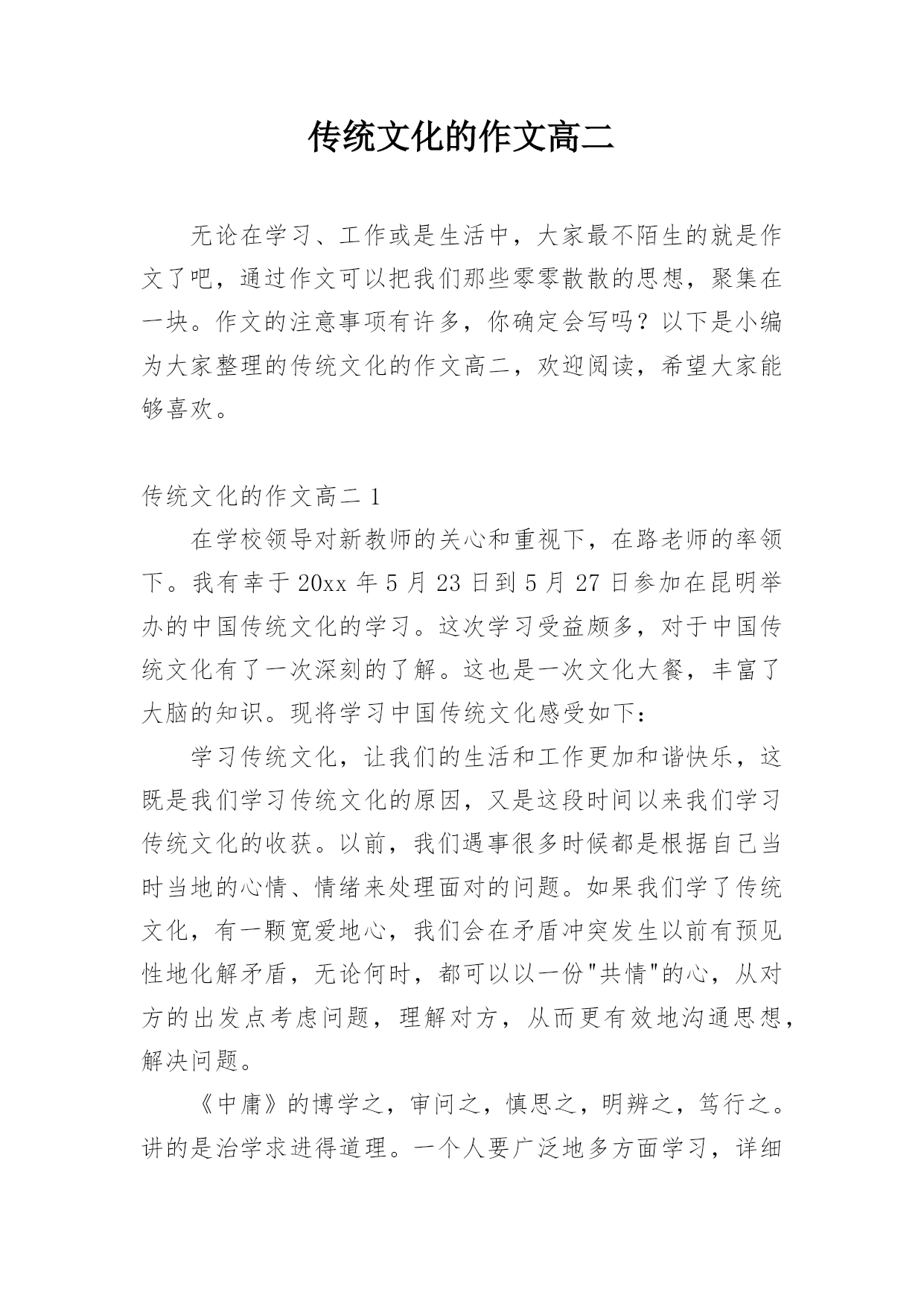 传统文化的作文高二无论在学习、工作或是生活中,大家最不陌生的就是作文了吧,通过作文可以把我们那些零零散散的思想,聚集在一块。作文的注意事项有许多,你确定会写吗?以下是小编为大家整理的传统文化的作文高二,欢迎阅读,希望大家能够喜欢。传统文化的作文高二1在学校领导对新教师的关心和重视下,在路老师的率领下。我有幸于20xx年5月23日到5月27日参加在昆明举办的中国传统文化的学习。这次学习受益颇多,对于中国传统文化有了一次深刻的了解。这也是一次文化大餐,丰富了大脑的知识。现将学习中国传统文化感受如下:学习传统文