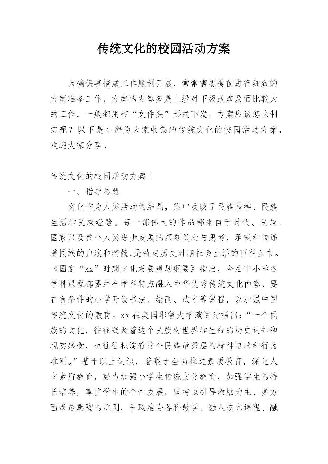 传统文化的校园活动方案为确保事情或工作顺利开展,常常需要提前进行细致的方案准备工作,方案的内容多是上级对下级或涉及面比较大的工作,一般都用带“文件头”形式下发。方案应该怎么制定呢?以下是小编为大家收集的传统文化的校园活动方案,欢迎大家分享。传统文化的校园活动方案1一、指导思想文化作为人类活动的结晶,集中反映了民族精神、民族生活和民族经验。每一部伟大的作品都来自于时代、民族、国家以及整个人类进步发展的深刻关心与思考,承载和传递着民族的血液和精髓,是特定历史时期社会生活的百科全书。《国家“xx”时期文化发展规