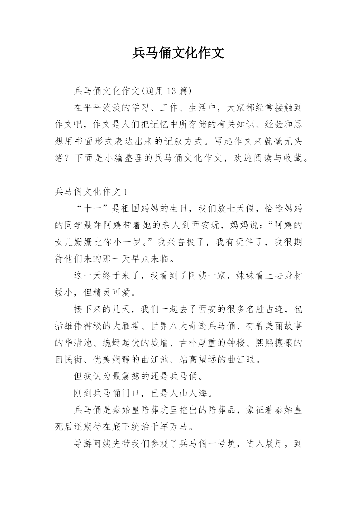 兵马俑文化作文兵马俑文化作文(通用13篇)在平平淡淡的学习、工作、生活中,大家都经常接触到作文吧,作文是人们把记忆中所存储的有关知识、经验和思想用书面形式表达出来的记叙方式。写起作文来就毫无头绪?下面是小编整理的兵马俑文化作文,欢迎阅读与收藏。兵马俑文化作文1“十一”是祖国妈妈的生日,我们放七天假,恰逢妈妈的同学聂萍阿姨带着她的亲人到西安玩,妈妈说:“阿姨的女儿姗姗比你小一岁。”我兴奋极了,我有玩伴了,我很期待他们来的那一天早点来临。这一天终于来了,我看到了阿姨一家,妹妹看上去身材矮小,但精灵可爱。接下来