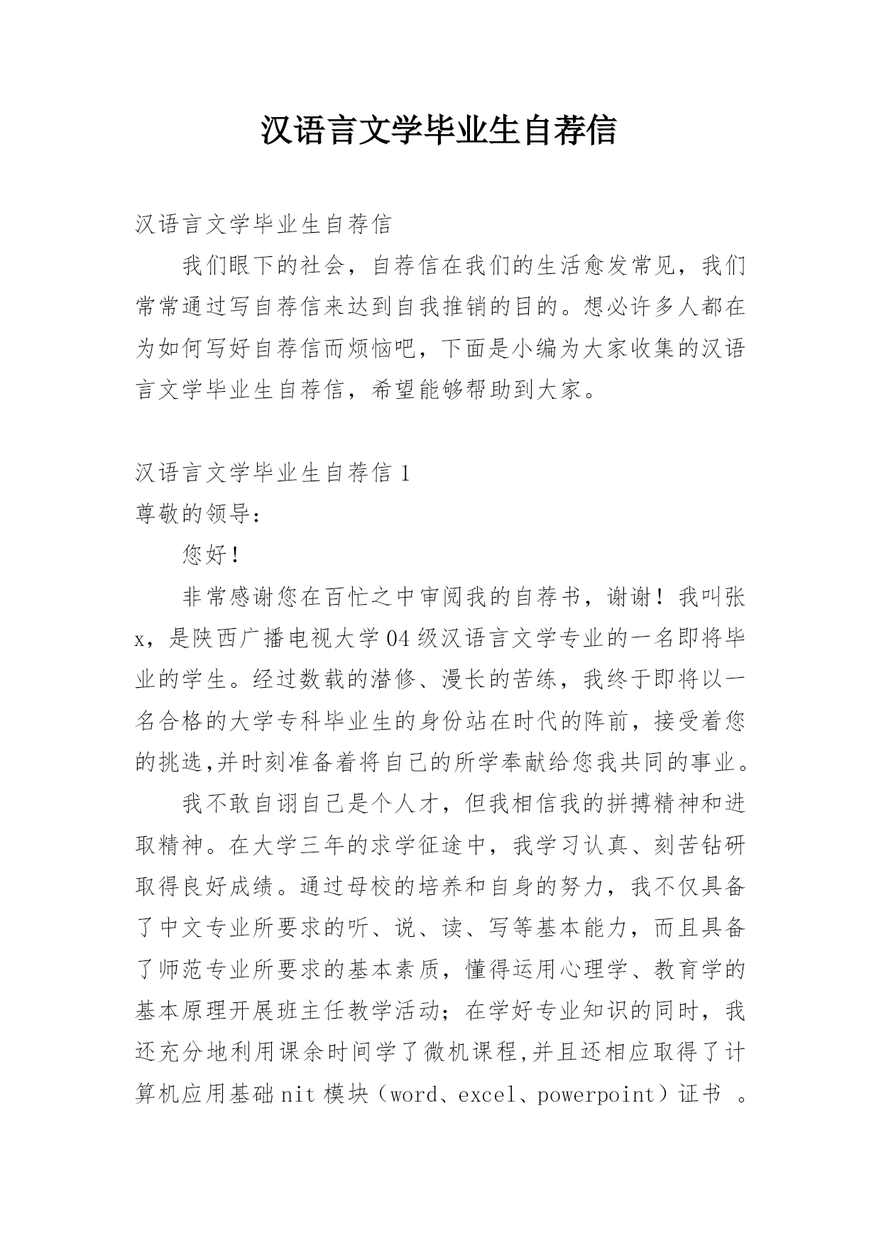 汉语言文学毕业生自荐信汉语言文学毕业生自荐信我们眼下的社会,自荐信在我们的生活愈发常见,我们常常通过写自荐信来达到自我推销的目的。想必许多人都在为如何写好自荐信而烦恼吧,下面是小编为大家收集的汉语言文学毕业生自荐信,希望能够帮助到大家。汉语言文学毕业生自荐信1尊敬的领导:您好!非常感谢您在百忙之中审阅我的自荐书,谢谢!我叫张x,是陕西广播电视大学04级汉语言文学专业的一名即将毕业的学生。经过数载的潜修、漫长的苦练,我终于即将以一名合格的大学专科毕业生的身份站在时代的阵前,接受着您的挑选,并时刻准备着将自己