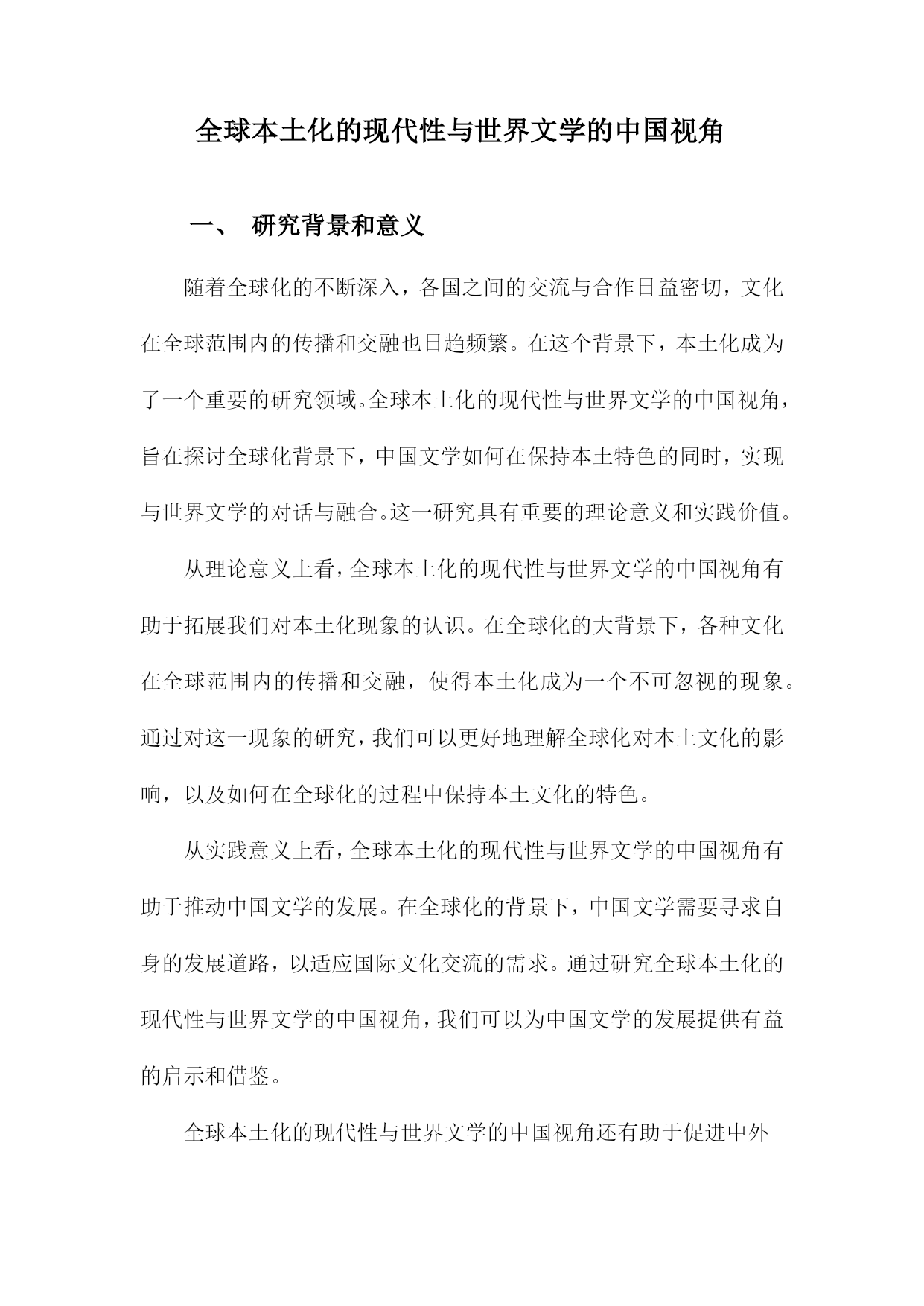 全球本土化的现代性与世界文学的中国视角一、研究背景和意义随着全球化的不断深入,各国之间的交流与合作日益密切,文化在全球范围内的传播和交融也日趋频繁。在这个背景下,本土化成为了一个重要的研究领域。全球本土化的现代性与世界文学的中国视角,旨在探讨全球化背景下,中国文学如何在保持本土特色的同时,实现与世界文学的对话与融合。这一研究具有重要的理论意义和实践价值。从理论意义上看,全球本土化的现代性与世界文学的中国视角有助于拓展我们对本土化现象的认识。在全球化的大背景下,各种文化在全球范围内的传播和交融,使得本土化成