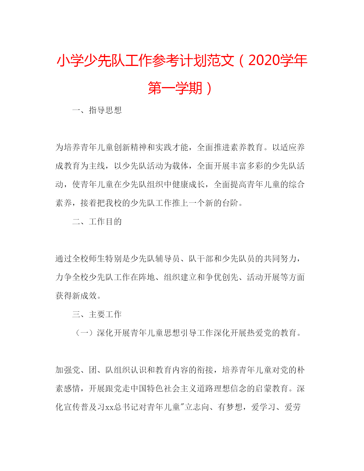 小学少先队工作参考计划范文(2020学年第一学期)一、指导思想为培养青年儿童创新精神和实践才能,全面推进素养教育。以适应养成教育为主线,以少先队活动为载体,全面开展丰富多彩的少先队活动,使青年儿童在少先队组织中健康成长,全面提高青年儿童的综合素养,接着把我校的少先队工作推上一个新的台阶。二、工作目的通过全校师生特别是少先队辅导员、队干部和少先队员的共同努力,力争全校少先队工作在阵地、组织建立和争优创先、活动开展等方面获得新成效。三、主要工作(一)深化开展青年儿童思想引导工作深化开展热爱党的教育。加强党、团