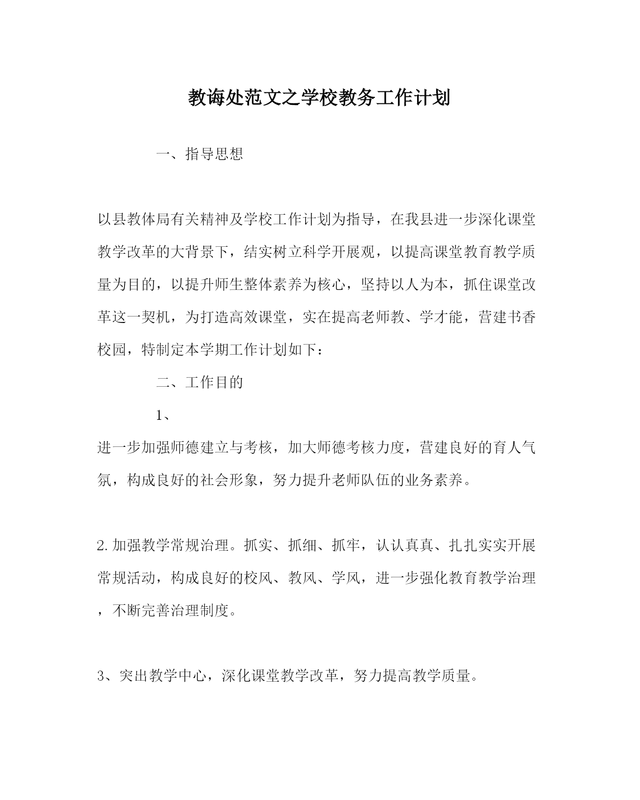 教诲处范文之学校教务工作计划一、指导思想以县教体局有关精神及学校工作计划为指导,在我县进一步深化课堂教学改革的大背景下,结实树立科学开展观,以提高课堂教育教学质量为目的,以提升师生整体素养为核心,坚持以人为本,抓住课堂改革这一契机,为打造高效课堂,实在提高老师教、学才能,营建书香校园,特制定本学期工作计划如下:二、工作目的1、进一步加强师德建立与考核,加大师德考核力度,营建良好的育人气氛,构成良好的社会形象,努力提升老师队伍的业务素养。2.加强教学常规治理。抓实、抓细、抓牢,认认真真、扎扎实实开展常规活动