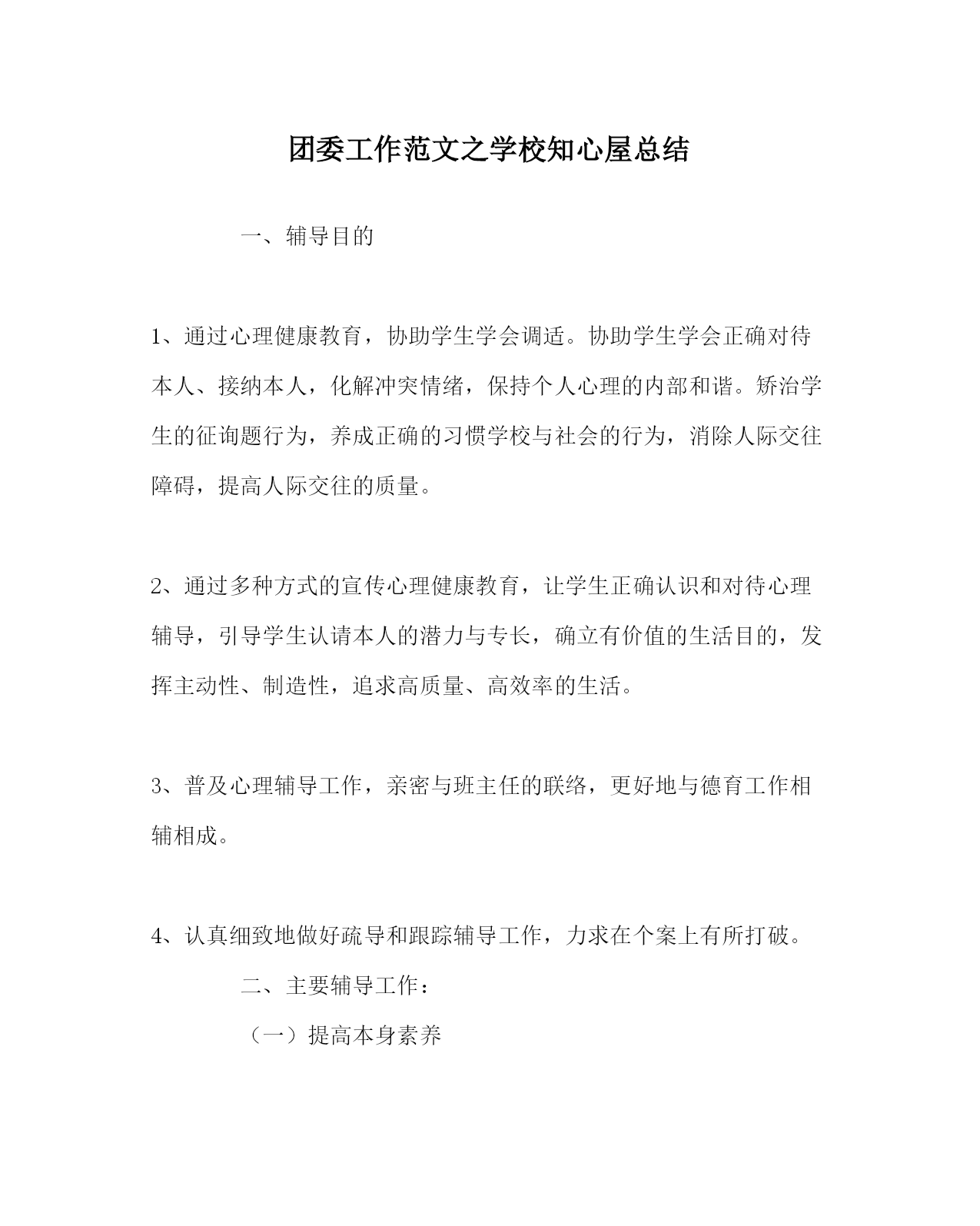 团委工作范文之学校知心屋总结一、辅导目的1、通过心理健康教育,协助学生学会调适。协助学生学会正确对待本人、接纳本人,化解冲突情绪,保持个人心理的内部和谐。矫治学生的征询题行为,养成正确的习惯学校与社会的行为,消除人际交往障碍,提高人际交往的质量。2、通过多种方式的宣传心理健康教育,让学生正确认识和对待心理辅导,引导学生认请本人的潜力与专长,确立有价值的生活目的,发挥主动性、制造性,追求高质量、高效率的生活。3、普及心理辅导工作,亲密与班主任的联络,更好地与德育工作相辅相成。4、认真细致地做好疏导和跟踪辅导