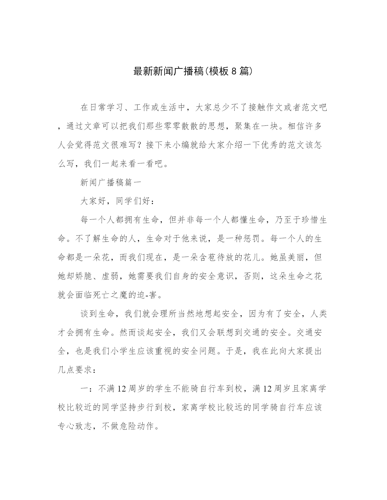 最新新闻广播稿(模板8篇)在日常学习、工作或生活中,大家总少不了接触作文或者范文吧,通过文章可以把我们那些零零散散的思想,聚集在一块。相信许多人会觉得范文很难写?接下来小编就给大家介绍一下优秀的范文该怎么写,我们一起来看一看吧。新闻广播稿篇一大家好,同学们好:每一个人都拥有生命,但并非每一个人都懂生命,乃至于珍惜生命。不了解生命的人,生命对于他来说,是一种惩罚。每一个人的生命都是一朵花,而我们现在,是一朵含苞待放的花儿。她虽美丽,但她却娇脆、虚弱,她需要我们自身的安全意识,否则,这朵生命之花就会面临死亡之