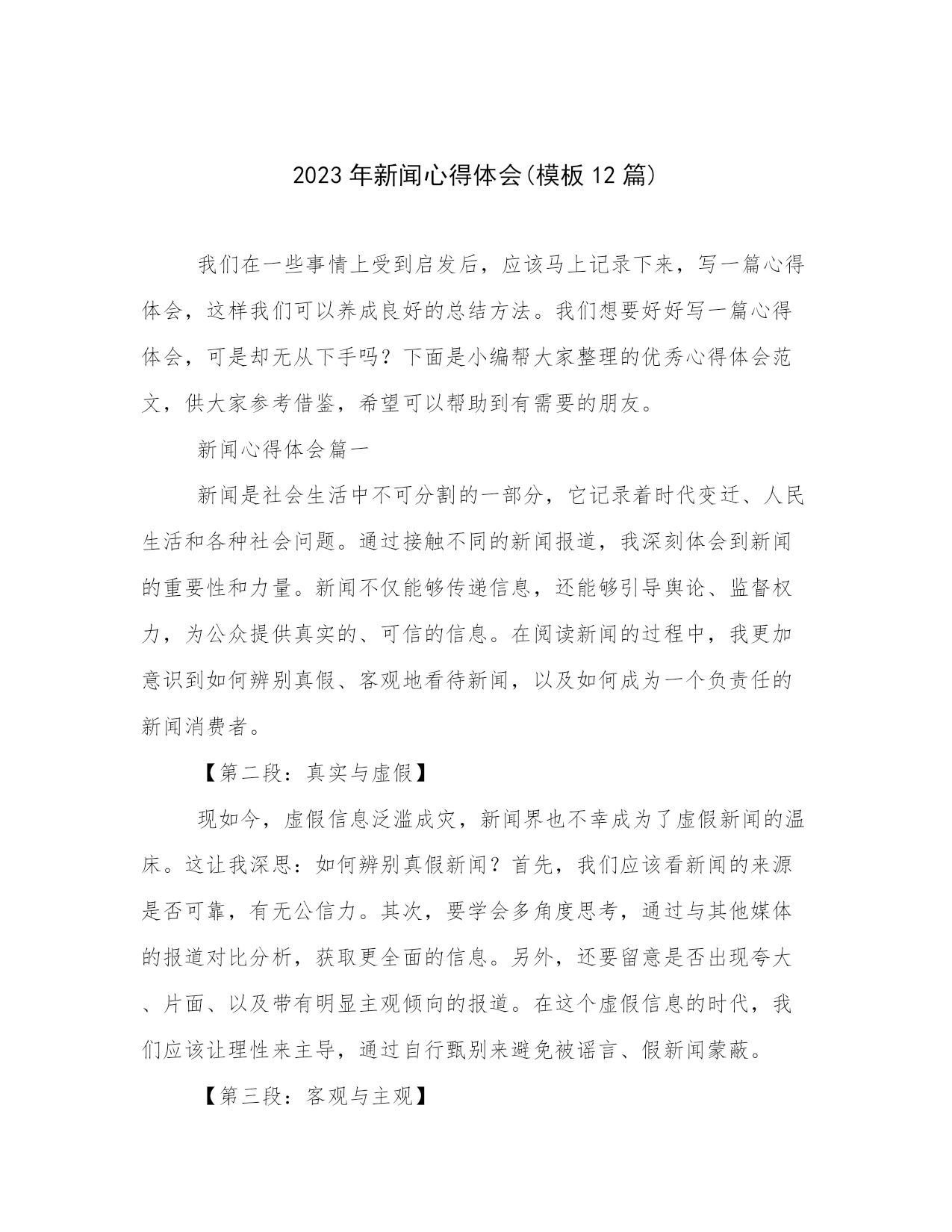 2023年新闻心得体会(模板12篇)我们在一些事情上受到启发后,应该马上记录下来,写一篇心得体会,这样我们可以养成良好的总结方法。我们想要好好写一篇心得体会,可是却无从下手吗?下面是小编帮大家整理的优秀心得体会范文,供大家参考借鉴,希望可以帮助到有需要的朋友。新闻心得体会篇一新闻是社会生活中不可分割的一部分,它记录着时代变迁、人民生活和各种社会问题。通过接触不同的新闻报道,我深刻体会到新闻的重要性和力量。新闻不仅能够传递信息,还能够引导舆论、监督权力,为公众提供真实的、可信的信息。在阅读新闻的过程中,我更