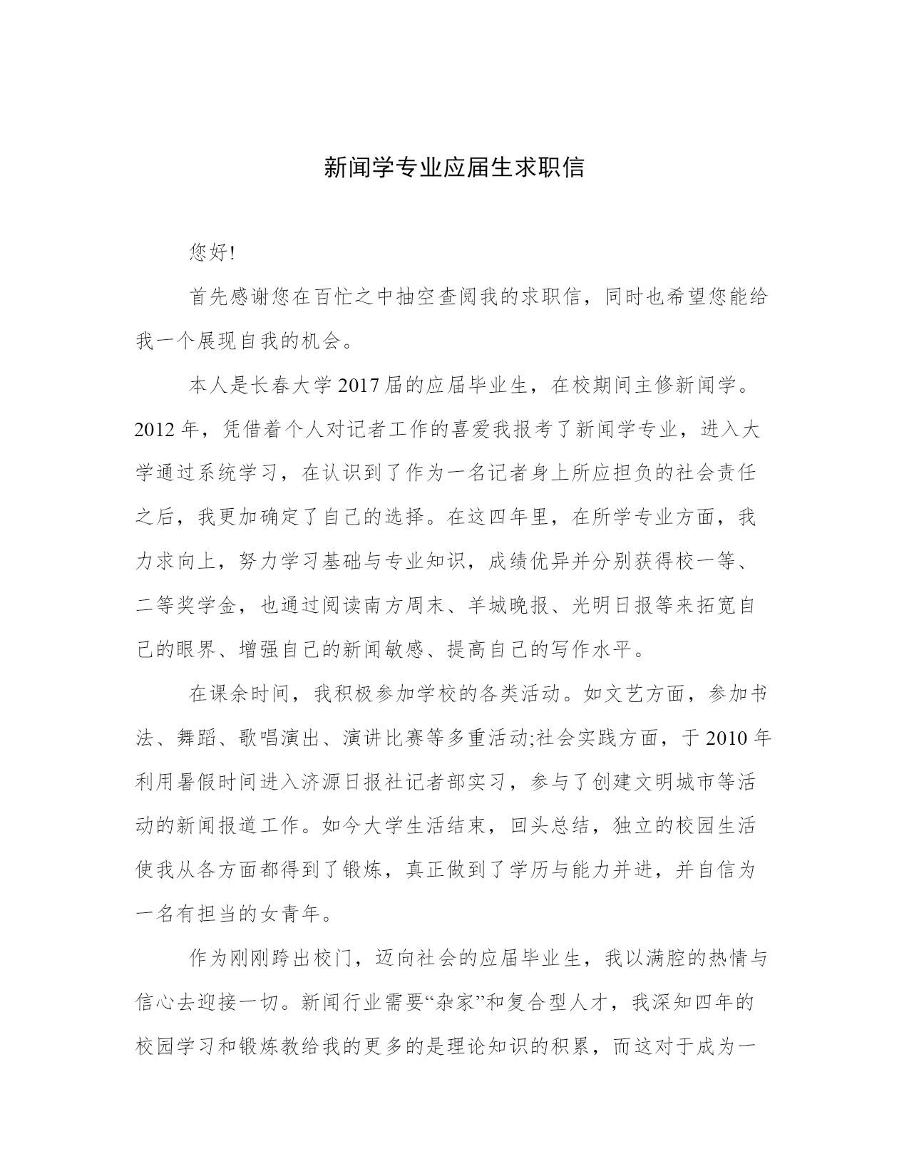 新闻学专业应届生求职信您好!首先感谢您在百忙之中抽空查阅我的求职信,同时也希望您能给我一个展现自我的机会。本人是长春大学2017届的应届毕业生,在校期间主修新闻学。2012年,凭借着个人对记者工作的喜爱我报考了新闻学专业,进入大学通过系统学习,在认识到了作为一名记者身上所应担负的社会责任之后,我更加确定了自己的选择。在这四年里,在所学专业方面,我力求向上,努力学习基础与专业知识,成绩优异并分别获得校一等、二等奖学金,也通过阅读南方周末、羊城晚报、光明日报等来拓宽自己的眼界、增强自己的新闻敏感、提高自己的写