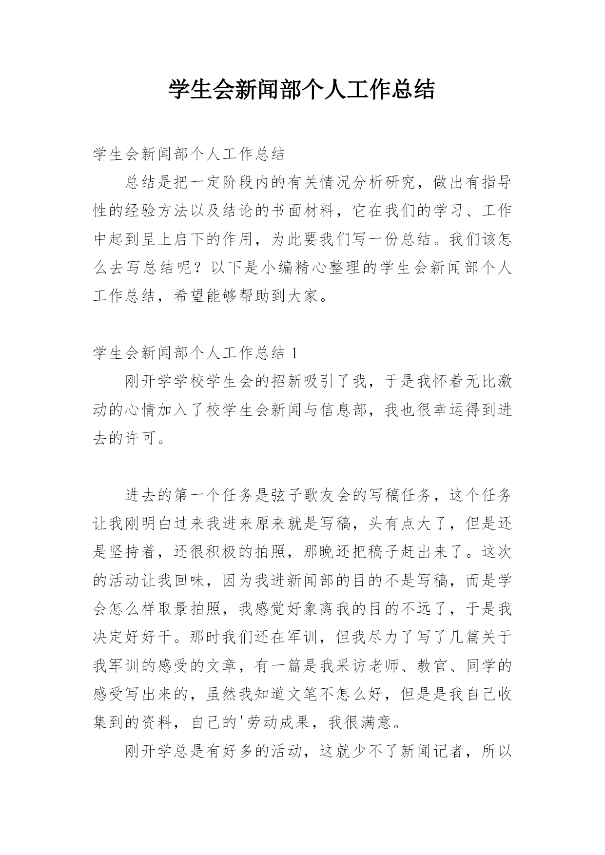 学生会新闻部个人工作总结学生会新闻部个人工作总结总结是把一定阶段内的有关情况分析研究,做出有指导性的经验方法以及结论的书面材料,它在我们的学习、工作中起到呈上启下的作用,为此要我们写一份总结。我们该怎么去写总结呢?以下是小编精心整理的学生会新闻部个人工作总结,希望能够帮助到大家。学生会新闻部个人工作总结1刚开学学校学生会的招新吸引了我,于是我怀着无比激动的心情加入了校学生会新闻与信息部,我也很幸运得到进去的许可。进去的第一个任务是弦子歌友会的写稿任务,这个任务让我刚明白过来我进来原来就是写稿,头有点大了,