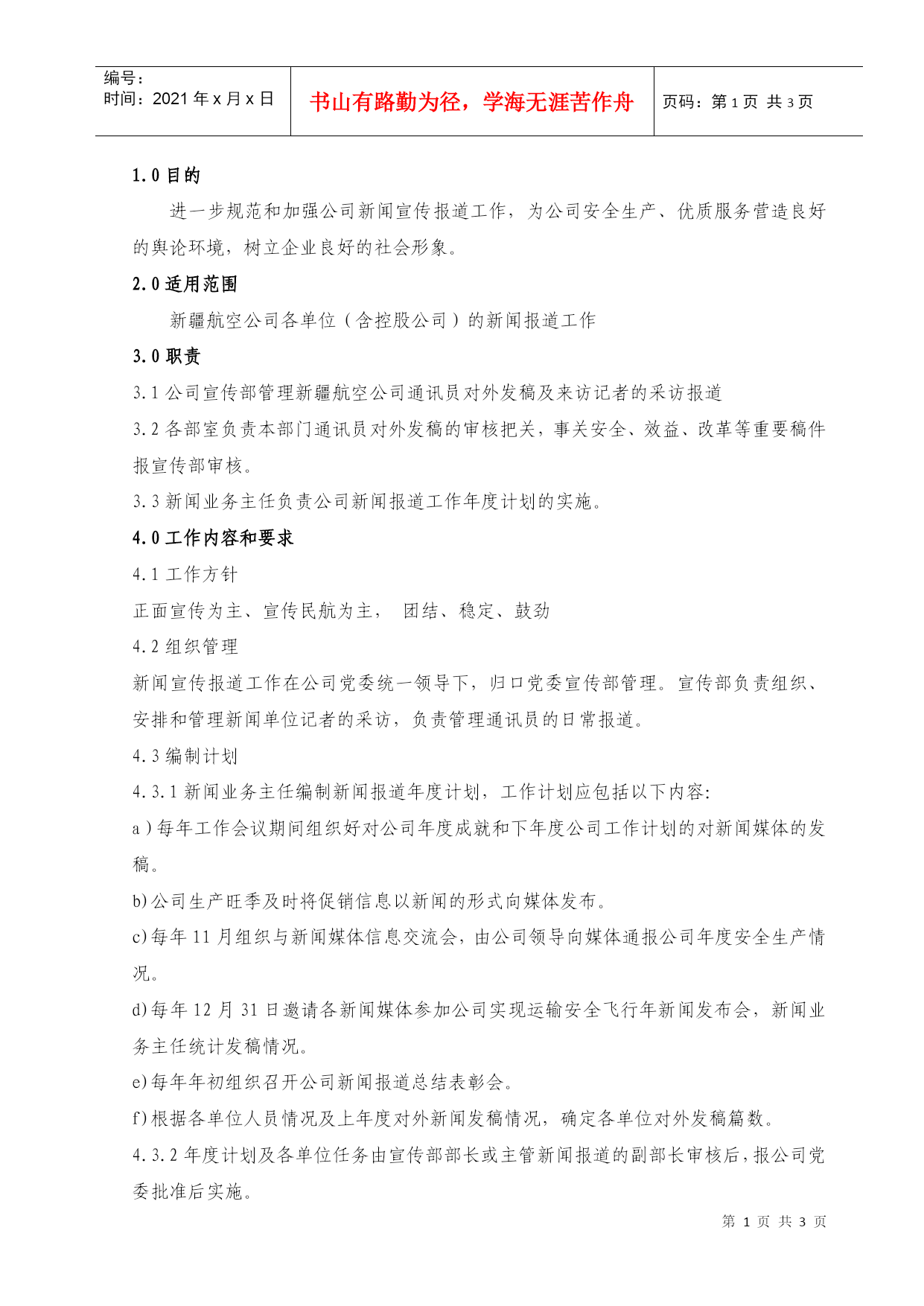 编号:时间:2021年x月x日书山有路勤为径,学海无涯苦作舟页码:第PAGE3页共NUMPAGES3页第PAGE\*MERGEFORMAT3页共NUMPAGES\*MERGEFORMAT3页1.0目的进一步规范和加强公司新闻宣传报道工作,为公司安全生产、优质服务营造良好的舆论环境,树立企业良好的社会形象。2.0适用范围新疆航空公司各单位(含控股公司)的新闻报道工作3.0职责3.1公司宣传部管理新疆航空公司通讯员对外发稿及来访记者的采访报道3.2各部室负责本部门通讯员对外发稿的审核把