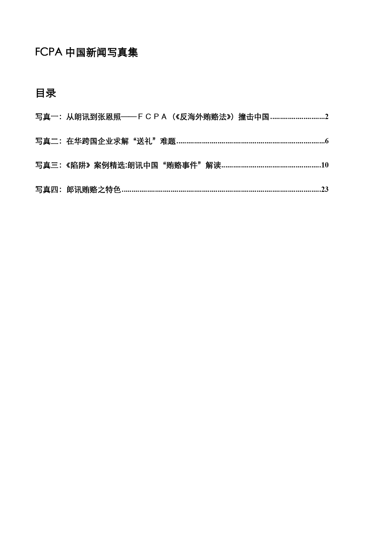 FCPA中国新闻写真集目录TOC\o写真一:从朗讯到张恩照——FCPA(《反海外贿赂法》)撞击中国PAGEREF_Toc211766052\h2写真二:在华跨国企业求解“送礼”难题PAGEREF_Toc211766053\h6写真三:《陷阱》案例精选:朗讯中国“贿赂事件”解读PAGEREF_Toc211766054\h10写真四:郎讯贿赂之特色PAGEREF_Toc211766055\h23编号:时间:2021年x月x日书山有路勤为径,学海无涯苦作舟页码:第PAGE29