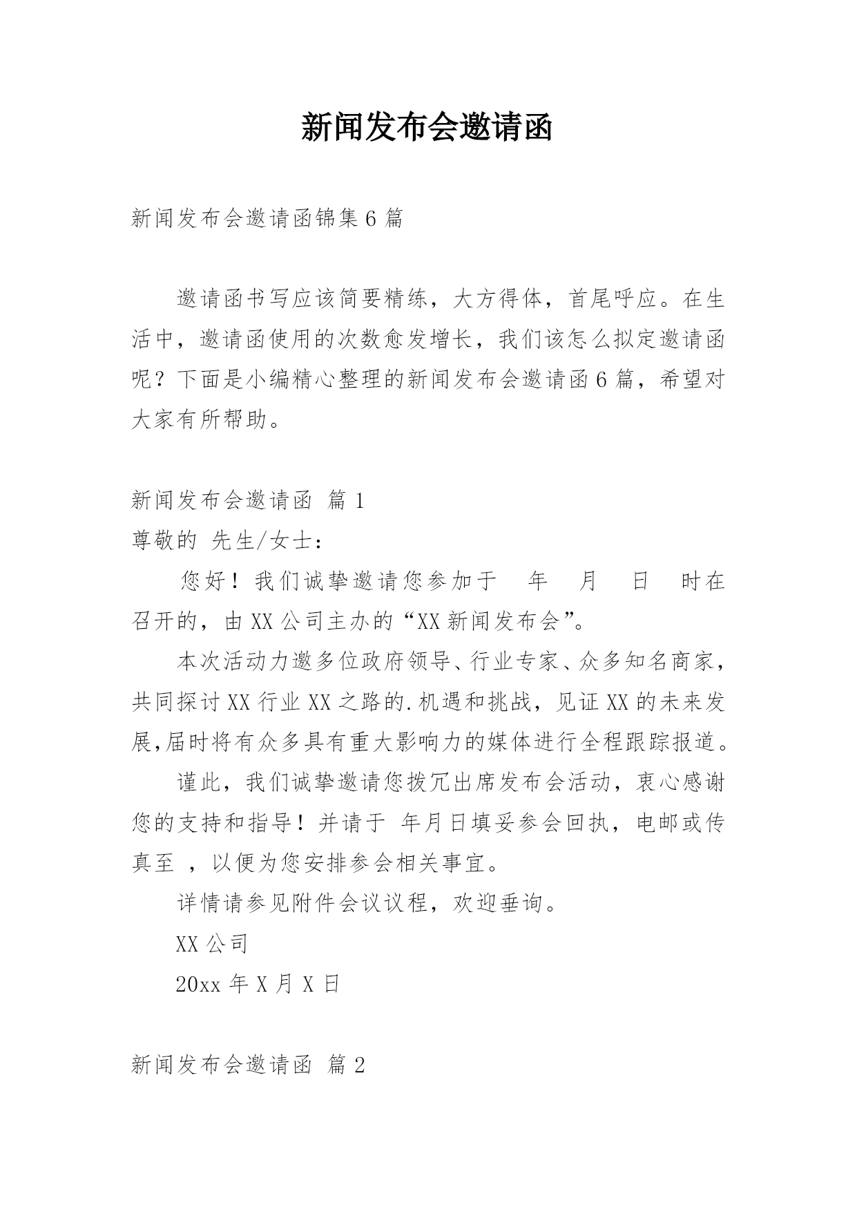 新闻发布会邀请函新闻发布会邀请函锦集6篇邀请函书写应该简要精练,大方得体,首尾呼应。在生活中,邀请函使用的次数愈发增长,我们该怎么拟定邀请函呢?下面是小编精心整理的新闻发布会邀请函6篇,希望对大家有所帮助。新闻发布会邀请函篇1尊敬的先生/女士:您好!我们诚挚邀请您参加于年月日时在召开的,由XX公司主办的“XX新闻发布会”。本次活动力邀多位政府领导、行业专家、众多知名商家,共同探讨XX行业XX之路的.机遇和挑战,见证XX的未来发展,届时将有众多具有重大影响力的媒体进行全程跟踪报道。谨此,我们诚挚邀请您拨冗出