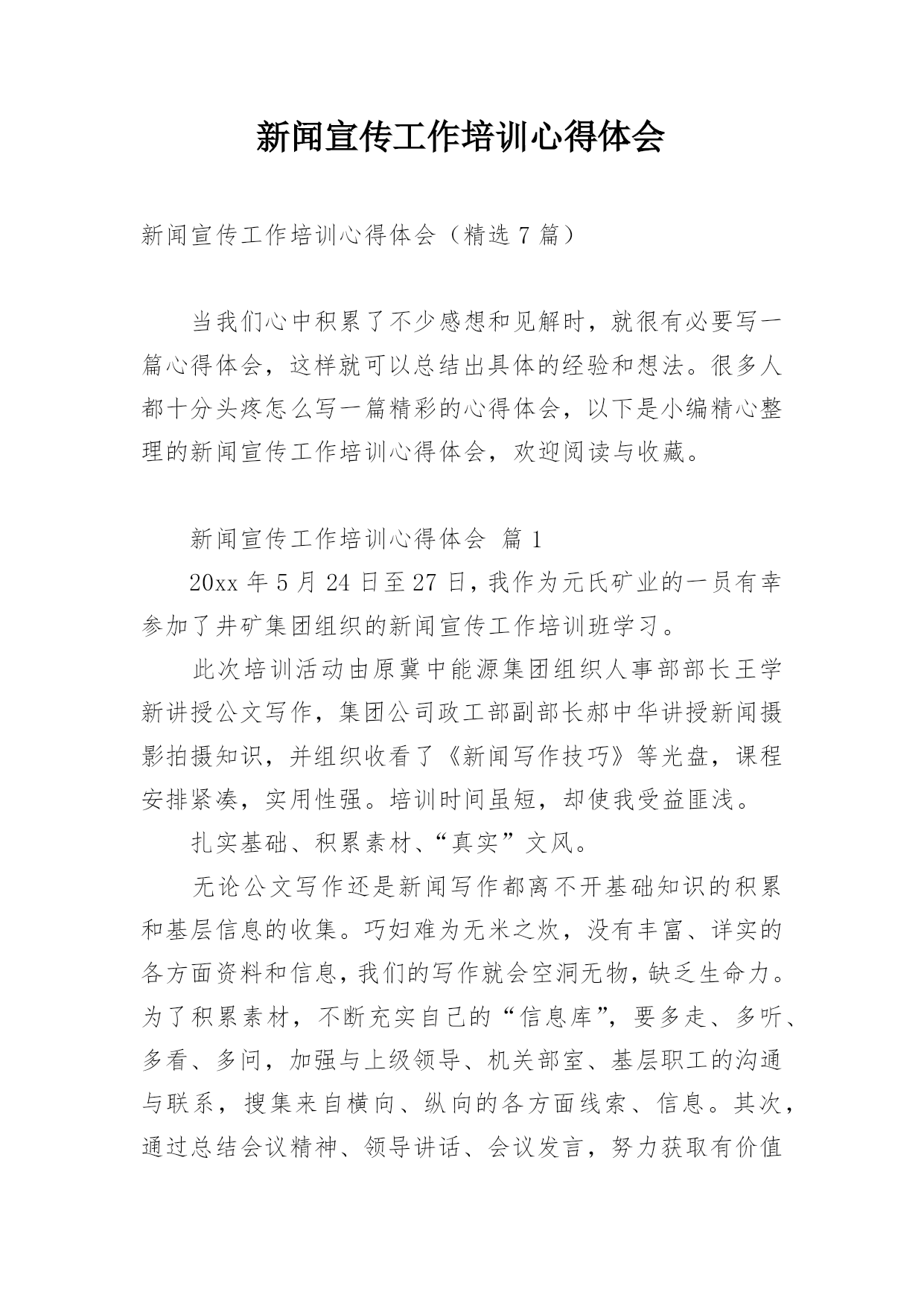 新闻宣传工作培训心得体会新闻宣传工作培训心得体会(精选7篇)当我们心中积累了不少感想和见解时,就很有必要写一篇心得体会,这样就可以总结出具体的经验和想法。很多人都十分头疼怎么写一篇精彩的心得体会,以下是小编精心整理的新闻宣传工作培训心得体会,欢迎阅读与收藏。新闻宣传工作培训心得体会篇120xx年5月24日至27日,我作为元氏矿业的一员有幸参加了井矿集团组织的新闻宣传工作培训班学习。此次培训活动由原冀中能源集团组织人事部部长王学新讲授公文写作,集团公司政工部副部长郝中华讲授新闻摄影拍摄知识,并组织收看了《新