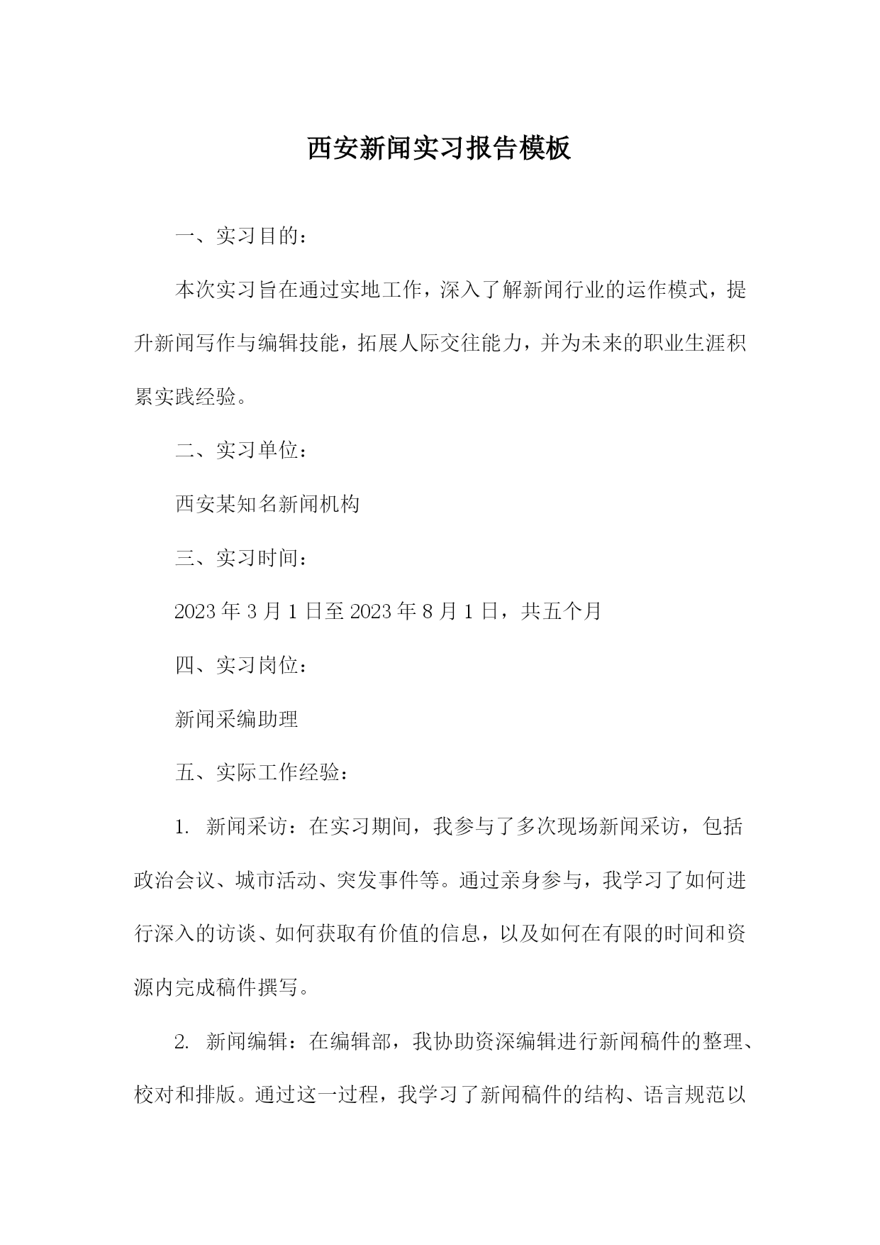 西安新闻实习报告模板一、实习目的:本次实习旨在通过实地工作,深入了解新闻行业的运作模式,提升新闻写作与编辑技能,拓展人际交往能力,并为未来的职业生涯积累实践经验。二、实习单位:西安某知名新闻机构三、实习时间:2023年3月1日至2023年8月1日,共五个月四、实习岗位:新闻采编助理五、实际工作经验:1.新闻采访:在实习期间,我参与了多次现场新闻采访,包括政治会议、城市活动、突发事件等。通过亲身参与,我学习了如何进行深入的访谈、如何获取有价值的信息,以及如何在有限的时间和资源内完成稿件撰写。2.新闻编辑:在