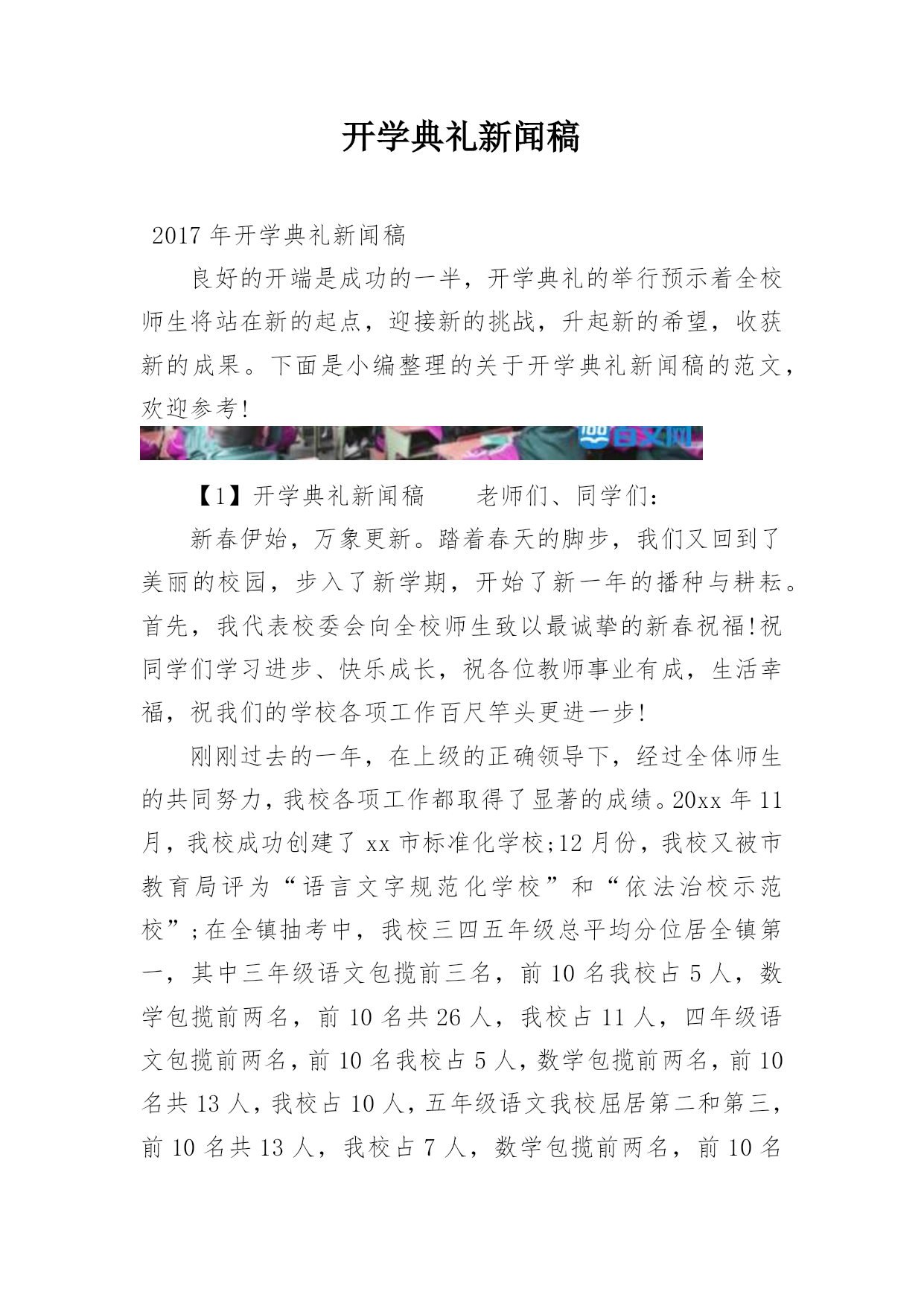 开学典礼新闻稿2017年开学典礼新闻稿良好的开端是成功的一半,开学典礼的举行预示着全校师生将站在新的起点,迎接新的挑战,升起新的希望,收获新的成果。下面是小编整理的关于开学典礼新闻稿的范文,欢迎参考!【1】开学典礼新闻稿老师们、同学们:新春伊始,万象更新。踏着春天的脚步,我们又回到了美丽的校园,步入了新学期,开始了新一年的播种与耕耘。首先,我代表校委会向全校师生致以最诚挚的新春祝福!祝同学们学习进步、快乐成长,祝各位教师事业有成,生活幸福,祝我们的学校各项工作百尺竿头更进一步!刚刚过去的一年,在上级的正确