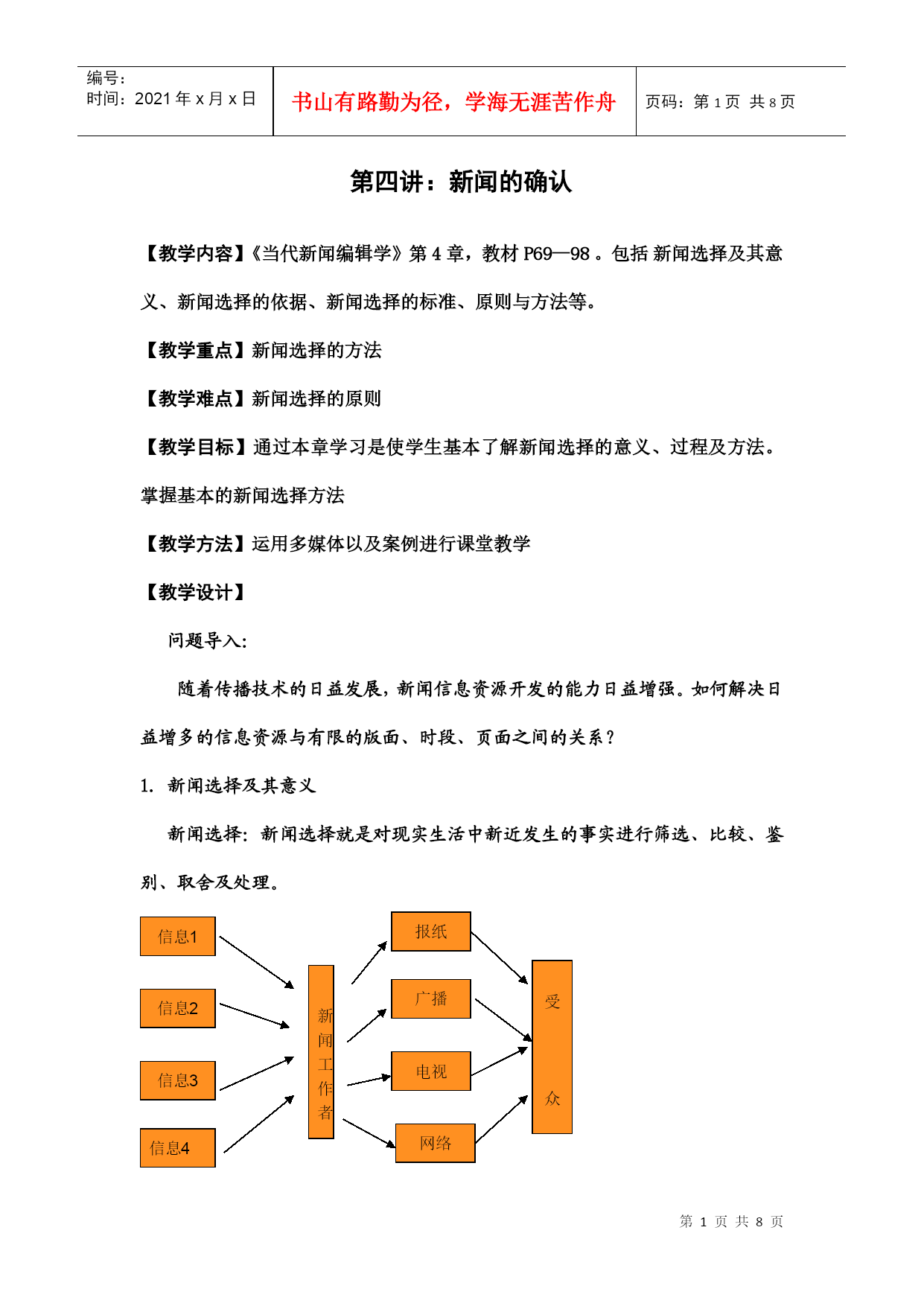 编号:时间:2021年x月x日书山有路勤为径,学海无涯苦作舟页码:第PAGE8页共NUMPAGES8页第PAGE\*MERGEFORMAT8页共NUMPAGES\*MERGEFORMAT8页第四讲:新闻的确认【教学内容】《当代新闻编辑学》第4章,教材P69—98。包括新闻选择及其意义、新闻选择的依据、新闻选择的标准、原则与方法等。【教学重点】新闻选择的方法【教学难点】新闻选择的原则【教学目标】通过本章学习是使学生基本了解新闻选择的意义、过程及方法。掌握基本的新闻选择方法【教学方法】