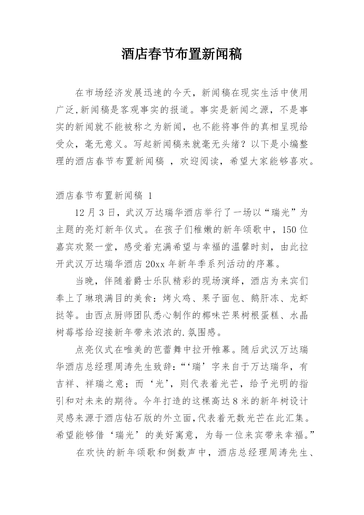 酒店春节布置新闻稿在市场经济发展迅速的今天,新闻稿在现实生活中使用广泛,新闻稿是客观事实的报道。事实是新闻之源,不是事实的新闻就不能被称之为新闻,也不能将事件的真相呈现给受众,毫无意义。写起新闻稿来就毫无头绪?以下是小编整理的酒店春节布置新闻稿,欢迎阅读,希望大家能够喜欢。酒店春节布置新闻稿112月3日,武汉万达瑞华酒店举行了一场以“瑞光”为主题的亮灯新年仪式。在孩子们稚嫩的新年颂歌中,150位嘉宾欢聚一堂,感受着充满希望与幸福的温馨时刻,由此拉开武汉万达瑞华酒店20xx年新年季系列活动的序幕。当晚,伴随