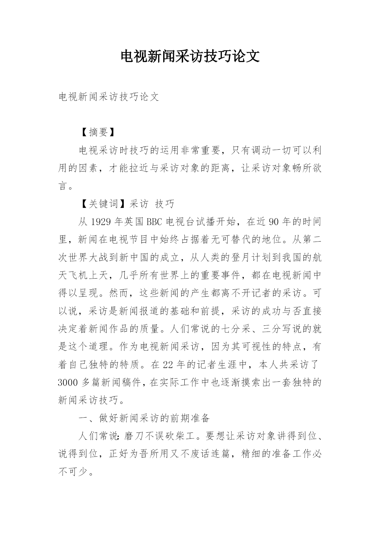 电视新闻采访技巧论文电视新闻采访技巧论文【摘要】电视采访时技巧的运用非常重要,只有调动一切可以利用的因素,才能拉近与采访对象的距离,让采访对象畅所欲言。【关键词】采访技巧从1929年英国BBC电视台试播开始,在近90年的时间里,新闻在电视节目中始终占据着无可替代的地位。从第二次世界大战到新中国的成立,从人类的登月计划到我国的航天飞机上天,几乎所有世界上的重要事件,都在电视新闻中得以呈现。然而,这些新闻的产生都离不开记者的采访。可以说,采访是新闻报道的基础和前提,采访的成功与否直接决定着新闻作品的质量。人们
