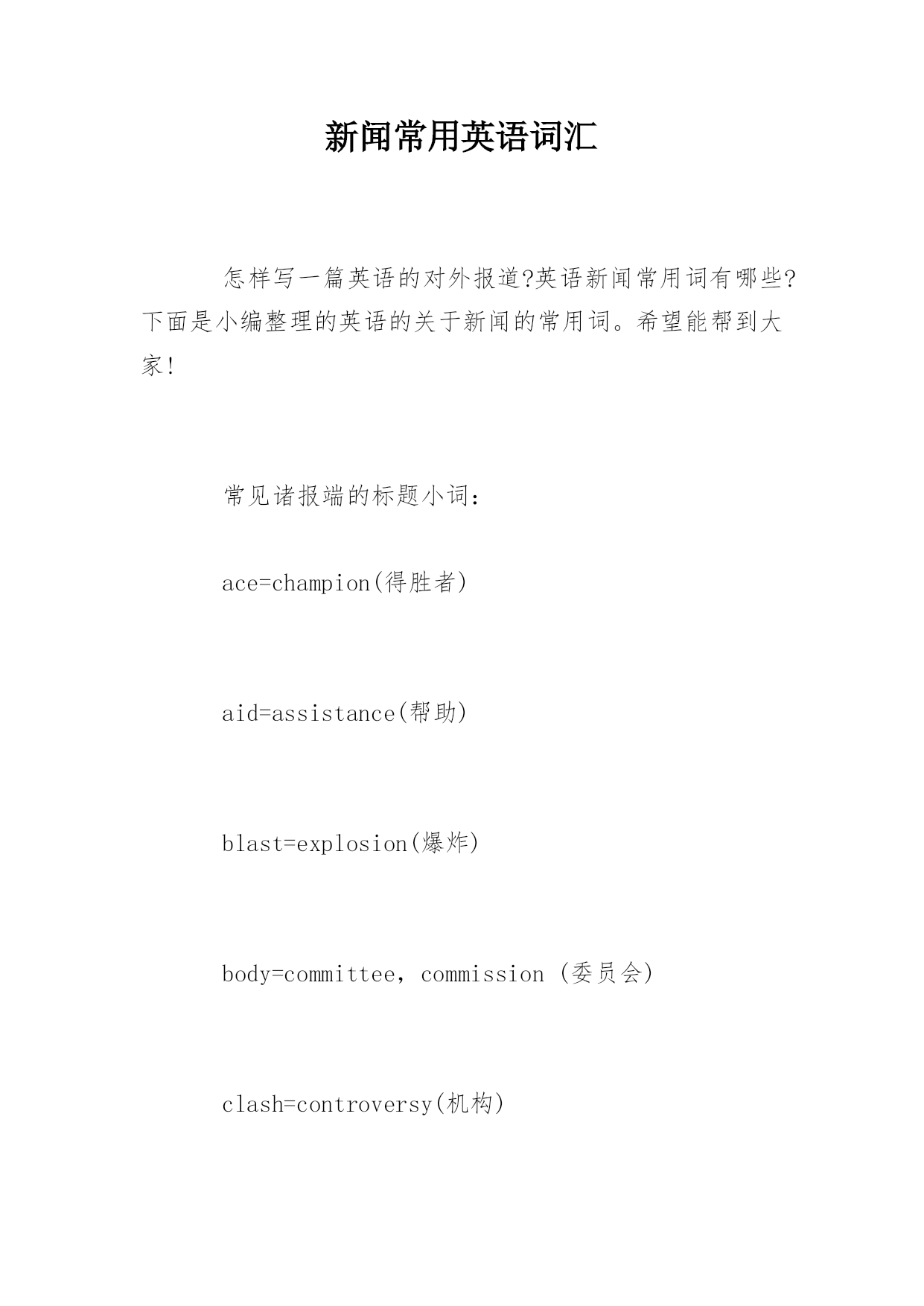 新闻常用英语词汇怎样写一篇英语的对外报道?英语新闻常用词有哪些?下面是小编整理的英语的关于新闻的常用词。希望能帮到大家!常见诸报端的标题小词:ace=champion(得胜者)aid=assistance(帮助)blast=explosion(爆炸)body=committee,commission(委员会)clash=controversy(机构)crash=collision(碰撞,坠毁)deal=agreement,transaction(协议,交易)dems=democrats(民主主义者,民主人