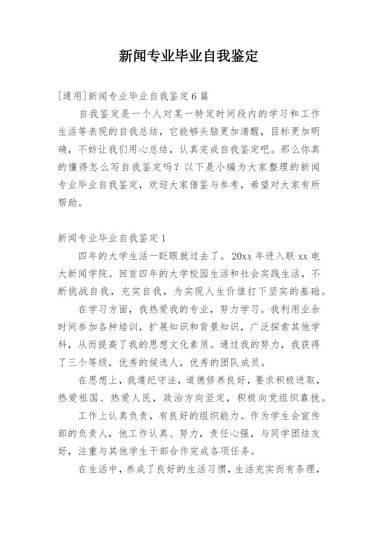 新闻专业毕业自我鉴定[通用]新闻专业毕业自我鉴定6篇自我鉴定是一个人对某一特定时间段内的学习和工作生活等表现的自我总结,它能够头脑更加清醒,目标更加明确,不妨让我们用心总结,认真完成自我鉴定吧。那么你真的懂得怎么写自我鉴定吗?以下是小编为大家整理的新闻专业毕业自我鉴定,欢迎大家借鉴与参考,希望对大家有所帮助。新闻专业毕业自我鉴定1四年的大学生活一眨眼就过去了。20xx年进入联xx电大新闻学院。回首四年的大学校园生活和社会实践生活,不断挑战自我,充实自我,为实现人生价值打下坚实的基础。在学习方面,我热爱我的