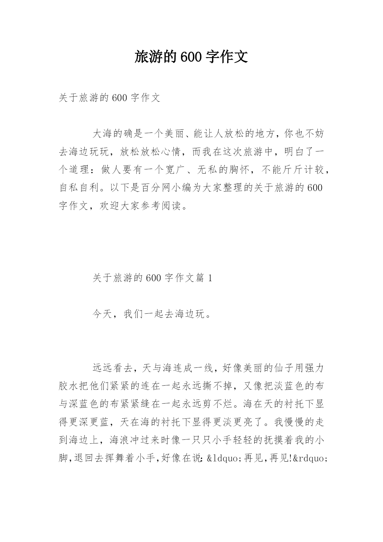 旅游的600字作文关于旅游的600字作文大海的确是一个美丽、能让人放松的地方,你也不妨去海边玩玩,放松放松心情,而我在这次旅游中,明白了一个道理:做人要有一个宽广、无私的胸怀,不能斤斤计较,自私自利。以下是百分网小编为大家整理的关于旅游的600字作文,欢迎大家参考阅读。关于旅游的600字作文篇1今天,我们一起去海边玩。远远看去,天与海连成一线,好像美丽的仙子用强力胶水把他们紧紧的连在一起永远撕不掉,又像把淡蓝色的布与深蓝色的布紧紧缝在一起永远剪不烂。海在天的衬托下显得更深更蓝,天在海的衬托下显得更淡更亮了