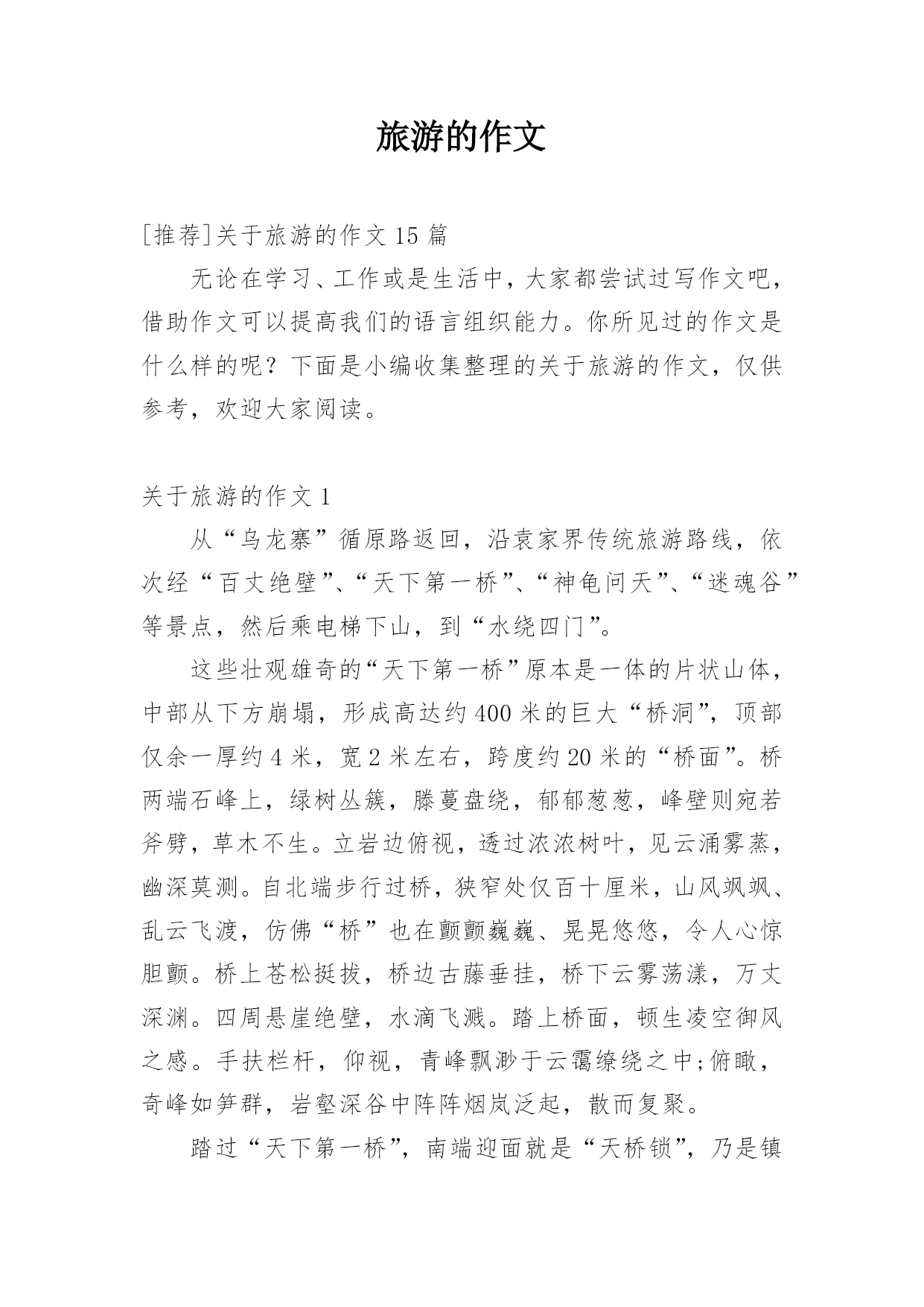 旅游的作文[推荐]关于旅游的作文15篇无论在学习、工作或是生活中,大家都尝试过写作文吧,借助作文可以提高我们的语言组织能力。你所见过的作文是什么样的呢?下面是小编收集整理的关于旅游的作文,仅供参考,欢迎大家阅读。关于旅游的作文1从“乌龙寨”循原路返回,沿袁家界传统旅游路线,依次经“百丈绝壁”、“天下第一桥”、“神龟问天”、“迷魂谷”等景点,然后乘电梯下山,到“水绕四门”。这些壮观雄奇的“天下第一桥”原本是一体的片状山体,中部从下方崩塌,形成高达约400米的巨大“桥洞”,顶部仅余一厚约4米,宽2米左右,跨度