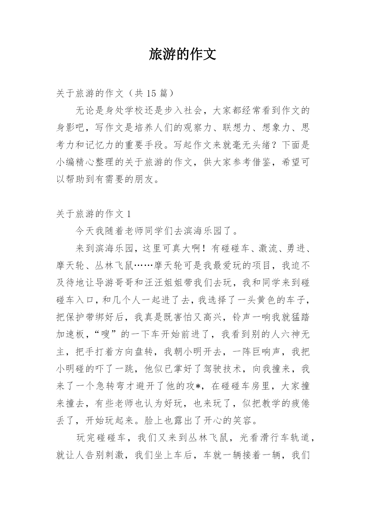 旅游的作文关于旅游的作文(共15篇)无论是身处学校还是步入社会,大家都经常看到作文的身影吧,写作文是培养人们的观察力、联想力、想象力、思考力和记忆力的重要手段。写起作文来就毫无头绪?下面是小编精心整理的关于旅游的作文,供大家参考借鉴,希望可以帮助到有需要的朋友。关于旅游的作文1今天我随着老师同学们去滨海乐园了。来到滨海乐园,这里可真大啊!有碰碰车、激流、勇进、摩天轮、丛林飞鼠……摩天轮可是我最爱玩的项目,我迫不及待地让导游哥哥和汪汪姐姐带我们去玩,我和同学来到碰碰车入口,和几个人一起进了去,我选择了一头黄