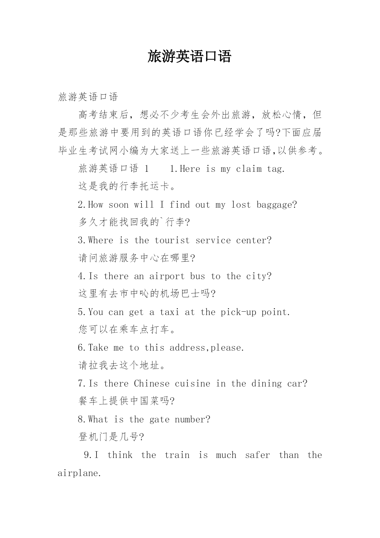旅游英语口语旅游英语口语高考结束后,想必不少考生会外出旅游,放松心情,但是那些旅游中要用到的英语口语你已经学会了吗?下面应届毕业生考试网小编为大家送上一些旅游英语口语,以供参考。旅游英语口语11.Hereismyclaimtag.这是我的行李托运卡。2.HowsoonwillIfindoutmylostbaggage?多久才能找回我的`行李?3.Whereisthetouristservicecenter?请问旅游服务中心在哪里?4.Isthereanairportbustothecity?这里有去市中吣