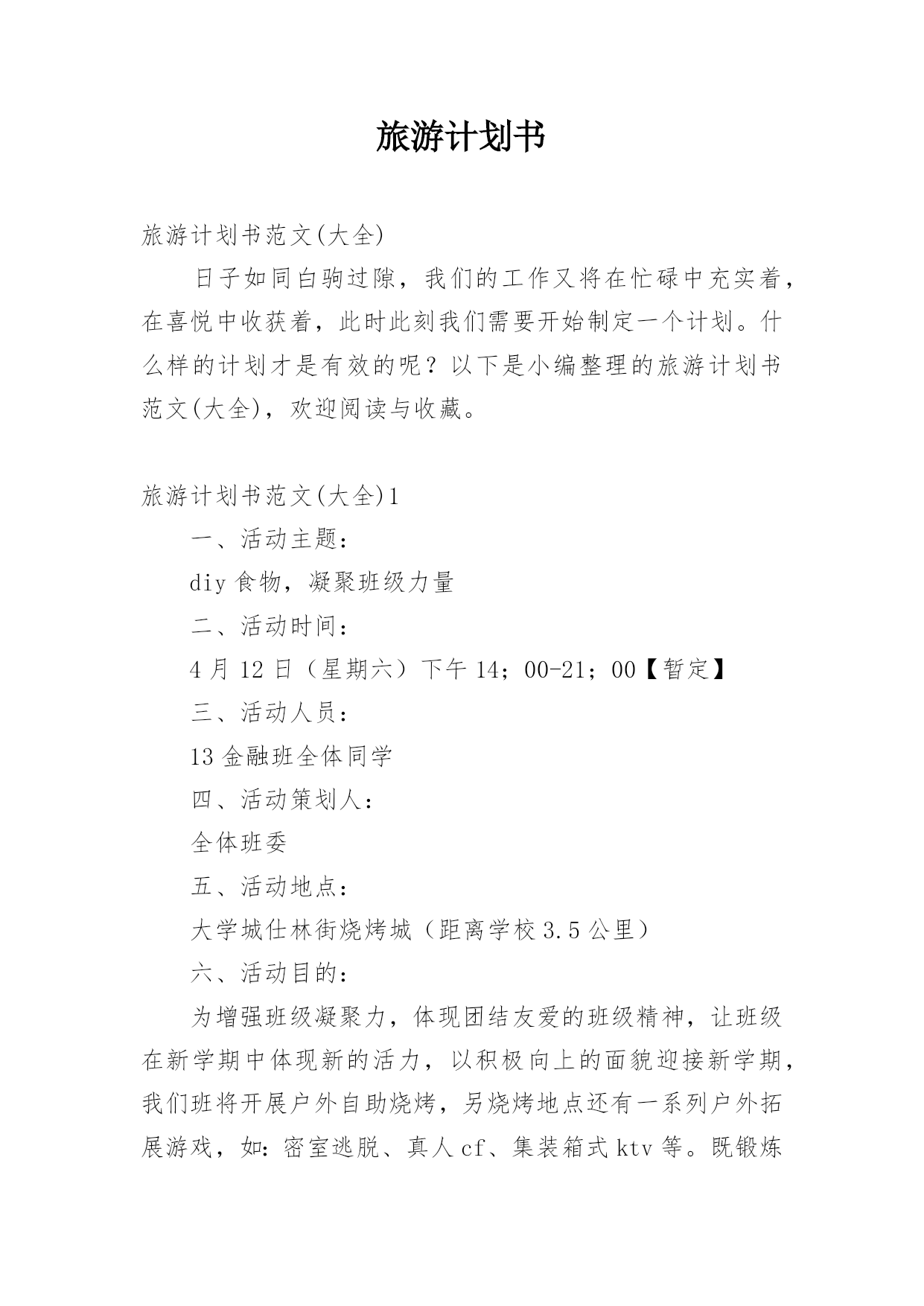 旅游计划书旅游计划书范文(大全)日子如同白驹过隙,我们的工作又将在忙碌中充实着,在喜悦中收获着,此时此刻我们需要开始制定一个计划。什么样的计划才是有效的呢?以下是小编整理的旅游计划书范文(大全),欢迎阅读与收藏。旅游计划书范文(大全)1一、活动主题:diy食物,凝聚班级力量二、活动时间:4月12日(星期六)下午14;00-21;00【暂定】三、活动人员:13金融班全体同学四、活动策划人:全体班委五、活动地点:大学城仕林街烧烤城(距离学校3.5公里)六、活动目的:为增强班级凝聚力,体现团结友爱的班级精神,让