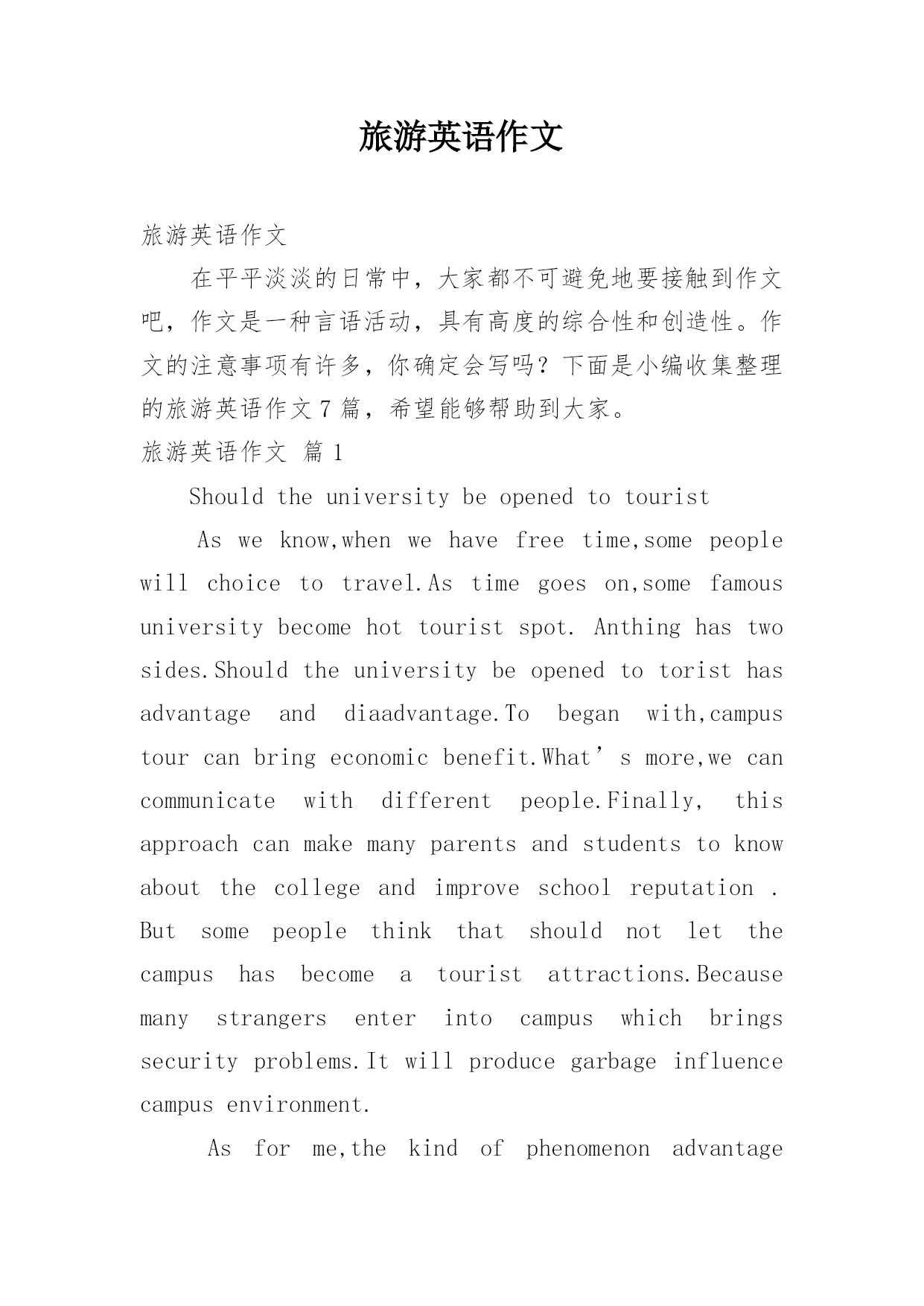 旅游英语作文旅游英语作文在平平淡淡的日常中,大家都不可避免地要接触到作文吧,作文是一种言语活动,具有高度的综合性和创造性。作文的注意事项有许多,你确定会写吗?下面是小编收集整理的旅游英语作文7篇,希望能够帮助到大家。旅游英语作文篇1ShouldtheuniversitybeopenedtotouristAsweknow,whenwehavefreetime,somepeoplewillchoicetotravel.Astimegoeson,somefamousuniversitybecomehottour