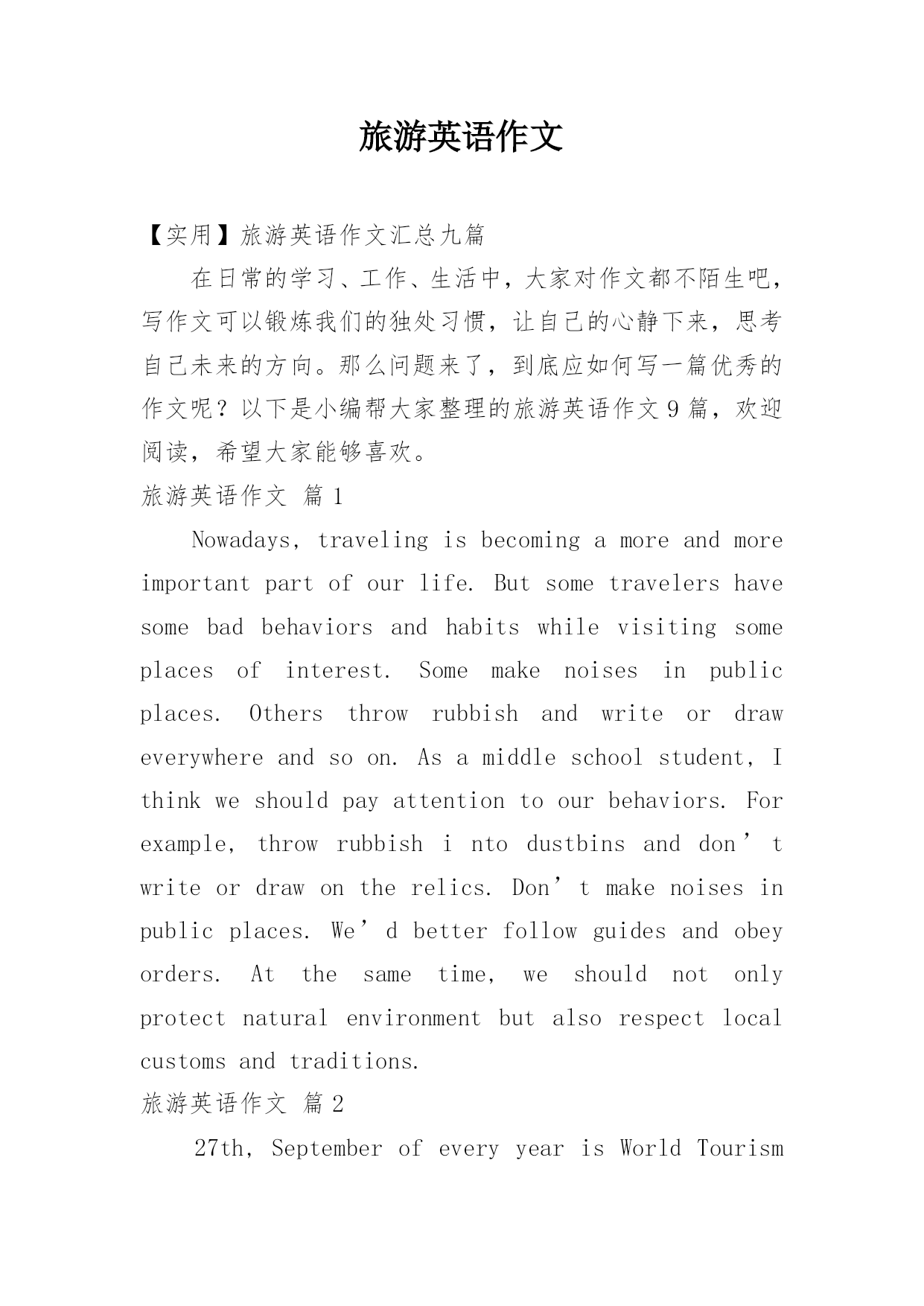 旅游英语作文【实用】旅游英语作文汇总九篇在日常的学习、工作、生活中,大家对作文都不陌生吧,写作文可以锻炼我们的独处习惯,让自己的心静下来,思考自己未来的方向。那么问题来了,到底应如何写一篇优秀的作文呢?以下是小编帮大家整理的旅游英语作文9篇,欢迎阅读,希望大家能够喜欢。旅游英语作文篇1Nowadays,travelingisbecomingamoreandmoreimportantpartofourlife.Butsometravelershavesomebadbehaviorsandhabitswhil