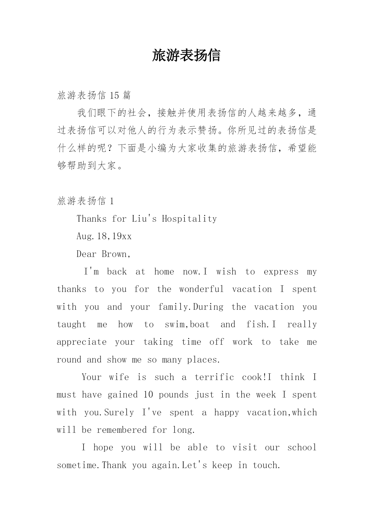 旅游表扬信旅游表扬信15篇我们眼下的社会,接触并使用表扬信的人越来越多,通过表扬信可以对他人的行为表示赞扬。你所见过的表扬信是什么样的呢?下面是小编为大家收集的旅游表扬信,希望能够帮助到大家。旅游表扬信1ThanksforLiu'sHospitalityAug.18,19xxDearBrown,I'mbackathomenow.IwishtoexpressmythankstoyouforthewonderfulvacationIspentwithyouandyourfamily.Duringthevaca