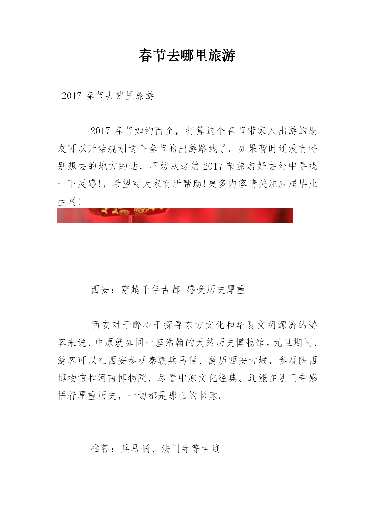 春节去哪里旅游2017春节去哪里旅游2017春节如约而至,打算这个春节带家人出游的朋友可以开始规划这个春节的出游路线了。如果暂时还没有特别想去的地方的话,不妨从这篇2017节旅游好去处中寻找一下灵感!,希望对大家有所帮助!更多内容请关注应届毕业生网!西安:穿越千年古都感受历史厚重西安对于醉心于探寻东方文化和华夏文明源流的游客来说,中原就如同一座浩翰的天然历史博物馆。元旦期间,游客可以在西安参观秦朝兵马俑、游历西安古城,参观陕西博物馆和河南博物院,尽看中原文化经典。还能在法门寺感悟着厚重历史,一切都是那么的