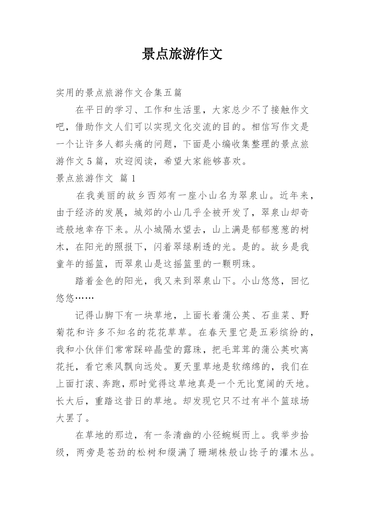 景点旅游作文实用的景点旅游作文合集五篇在平日的学习、工作和生活里,大家总少不了接触作文吧,借助作文人们可以实现文化交流的目的。相信写作文是一个让许多人都头痛的问题,下面是小编收集整理的景点旅游作文5篇,欢迎阅读,希望大家能够喜欢。景点旅游作文篇1在我美丽的故乡西郊有一座小山名为翠泉山。近年来,由于经济的发展,城郊的小山几乎全被开发了,翠泉山却奇迹般地幸存下来。从小城隔水望去,山上满是郁郁葱葱的树木,在阳光的照报下,闪着翠绿剔透的光。是的。故乡是我童年的摇篮,而翠泉山是这摇篮里的一颗明珠。踏着金色的阳光,我