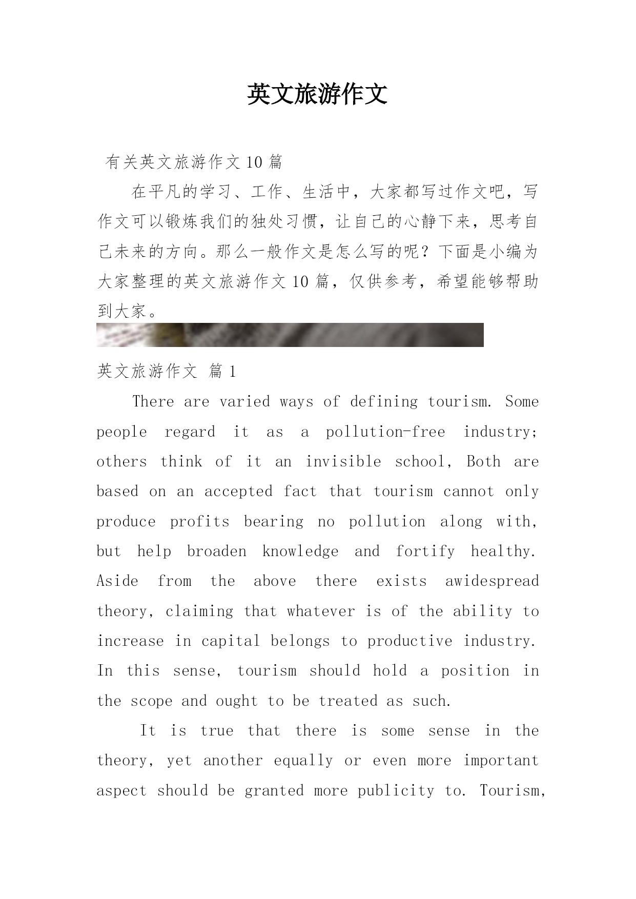 英文旅游作文有关英文旅游作文10篇在平凡的学习、工作、生活中,大家都写过作文吧,写作文可以锻炼我们的独处习惯,让自己的心静下来,思考自己未来的方向。那么一般作文是怎么写的呢?下面是小编为大家整理的英文旅游作文10篇,仅供参考,希望能够帮助到大家。英文旅游作文篇1Therearevariedwaysofdefiningtourism.Somepeopleregarditasapollution-freeindustry;othersthinkofitaninvisibleschool,Botharebase