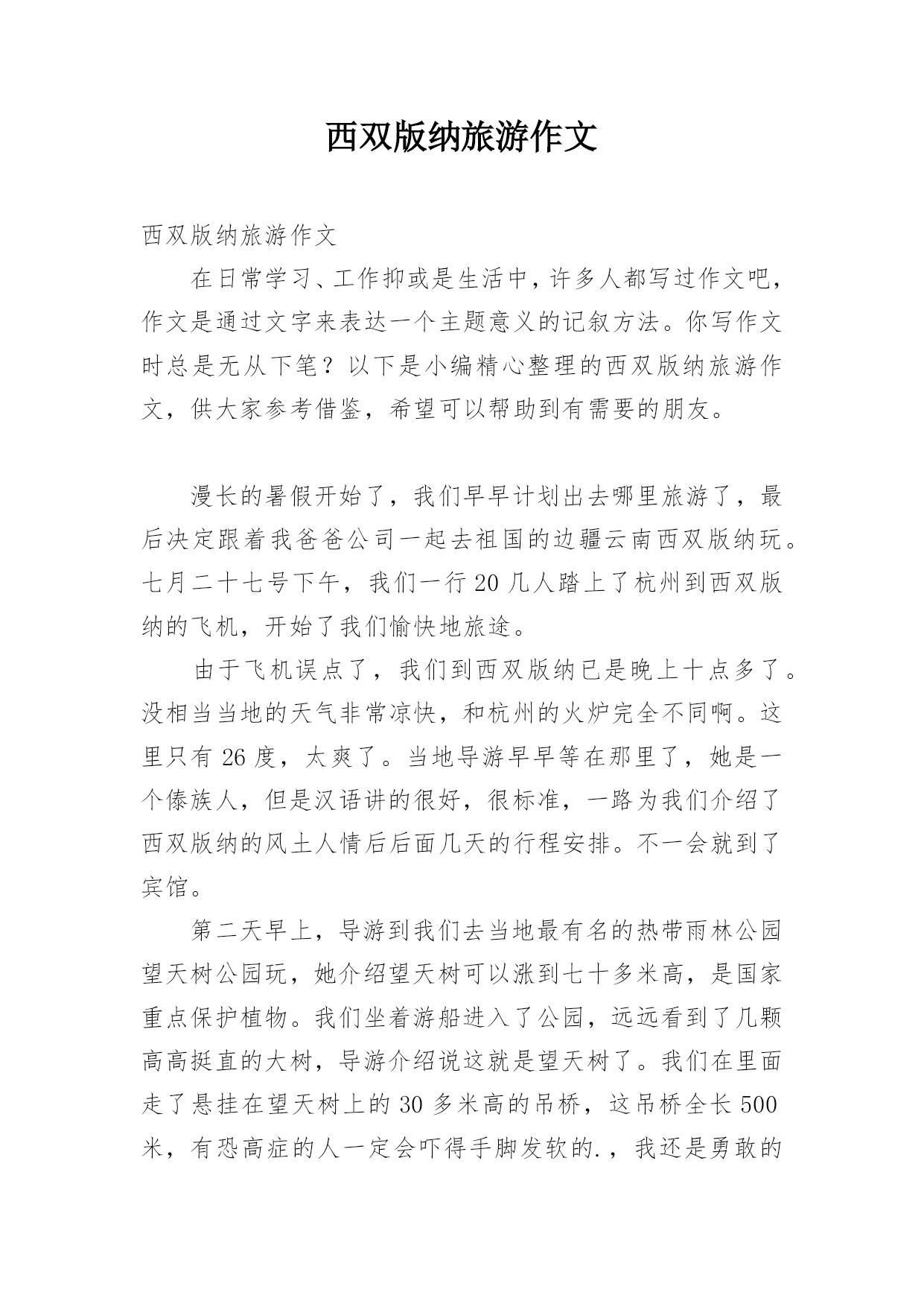 西双版纳旅游作文西双版纳旅游作文在日常学习、工作抑或是生活中,许多人都写过作文吧,作文是通过文字来表达一个主题意义的记叙方法。你写作文时总是无从下笔?以下是小编精心整理的西双版纳旅游作文,供大家参考借鉴,希望可以帮助到有需要的朋友。漫长的暑假开始了,我们早早计划出去哪里旅游了,最后决定跟着我爸爸公司一起去祖国的边疆云南西双版纳玩。七月二十七号下午,我们一行20几人踏上了杭州到西双版纳的飞机,开始了我们愉快地旅途。由于飞机误点了,我们到西双版纳已是晚上十点多了。没相当当地的天气非常凉快,和杭州的火炉完全不同