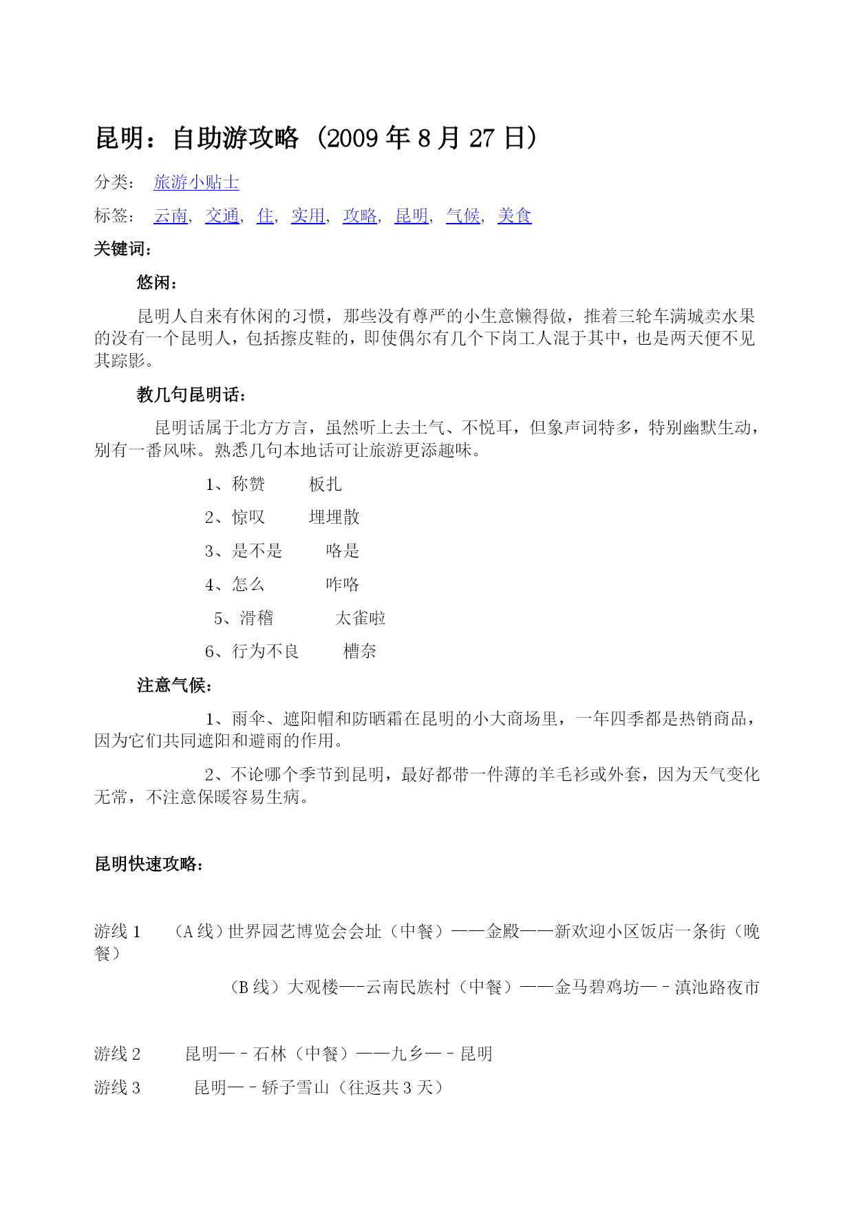 昆明:自助游攻略(2009年8月27日)分类:HYPERLINK"http://how.i.qunar.com/?cat=1201"\o"显示旅游小贴士的所有日志"旅游小贴士标签:HYPERLINK"http://how.i.qunar.com/?tag=%e4%ba%91%e5%8d%97"云南,HYPERLINK"http://how.i.qunar.com/?tag=%e4%ba%a4%e9%80%9a"交通,HYPERLINK"http://how.i.qunar.com/?t