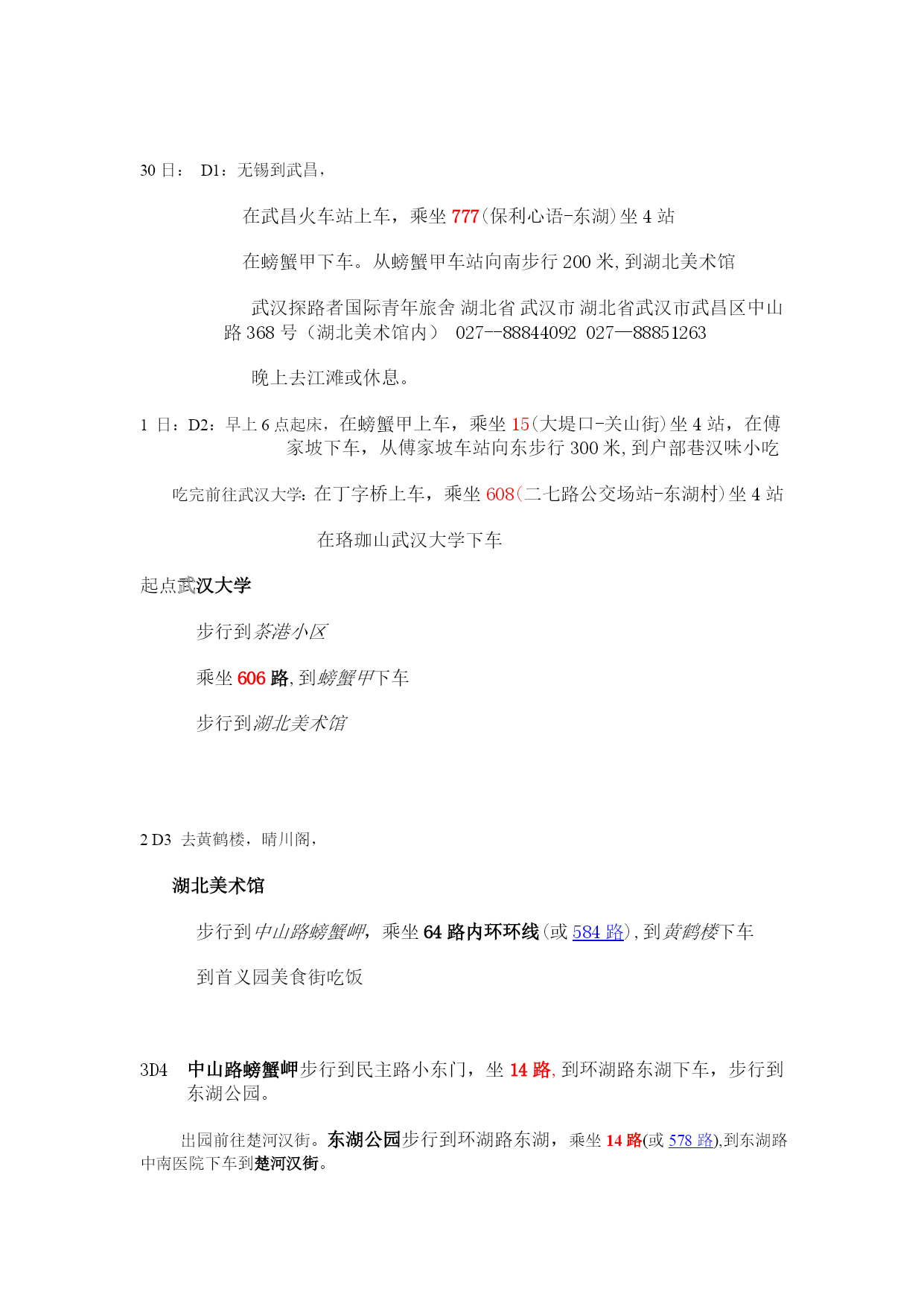 30日:D1:无锡到武昌,HYPERLINK"javascript://"在武昌火车站上车,乘坐777(保利心语-东湖)坐4站HYPERLINK"javascript://"在螃蟹甲下车。HYPERLINK"javascript://"从螃蟹甲车站向南步行200米,到湖北美术馆武汉探路者国际青年旅舍湖北省武汉市湖北省武汉市武昌区中山路368号(湖北美术馆内)027--88844092027—88851263晚上去江滩或休息。1日:D2:早上6点起床,HYPERLINK"javascri