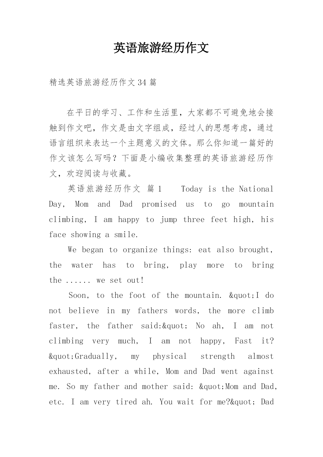 英语旅游经历作文精选英语旅游经历作文34篇在平日的学习、工作和生活里,大家都不可避免地会接触到作文吧,作文是由文字组成,经过人的思想考虑,通过语言组织来表达一个主题意义的文体。那么你知道一篇好的作文该怎么写吗?下面是小编收集整理的英语旅游经历作文,欢迎阅读与收藏。英语旅游经历作文篇1TodayistheNationalDay,MomandDadpromisedustogomountainclimbing,Iamhappytojumpthreefeethigh,hisfaceshowingasmile.We