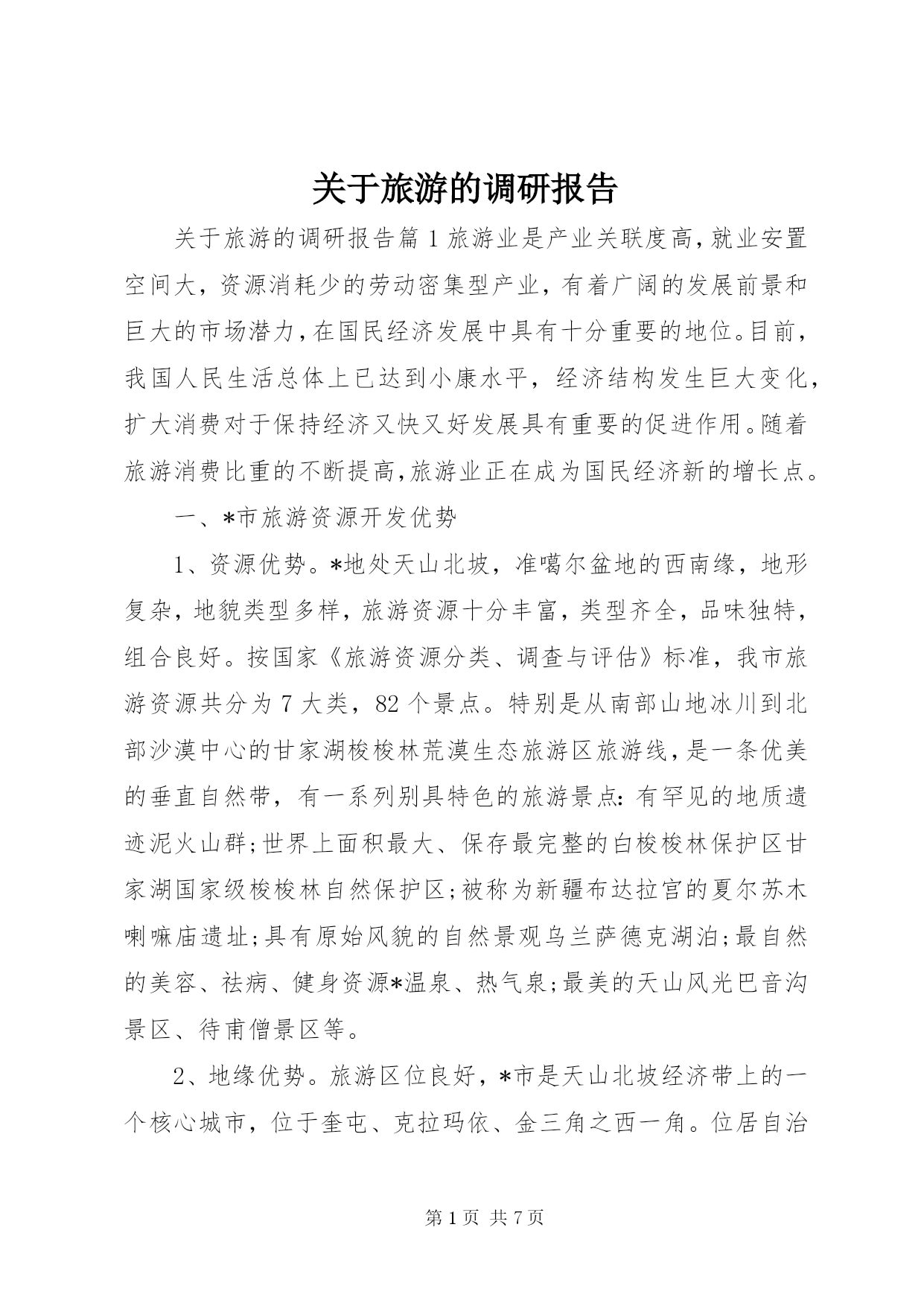 第PAGE\*Arabic\*MERGEFORMAT7页共NUMPAGES\*MERGEFORMAT7页关于旅游的调研报告关于旅游的调研报告篇1旅游业是产业关联度高,就业安置空间大,资源消耗少的劳动密集型产业,有着广阔的发展前景和巨大的市场潜力,在国民经济发展中具有十分重要的地位。目前,我国人民生活总体上已达到小康水平,经济结构发生巨大变化,扩大消费对于保持经济又快又好发展具有重要的促进作用。随着旅游消费比重的不断提高,旅游业正在成为国民经济新的增长点。一、*市旅游资源开发优势1、资源优势。*