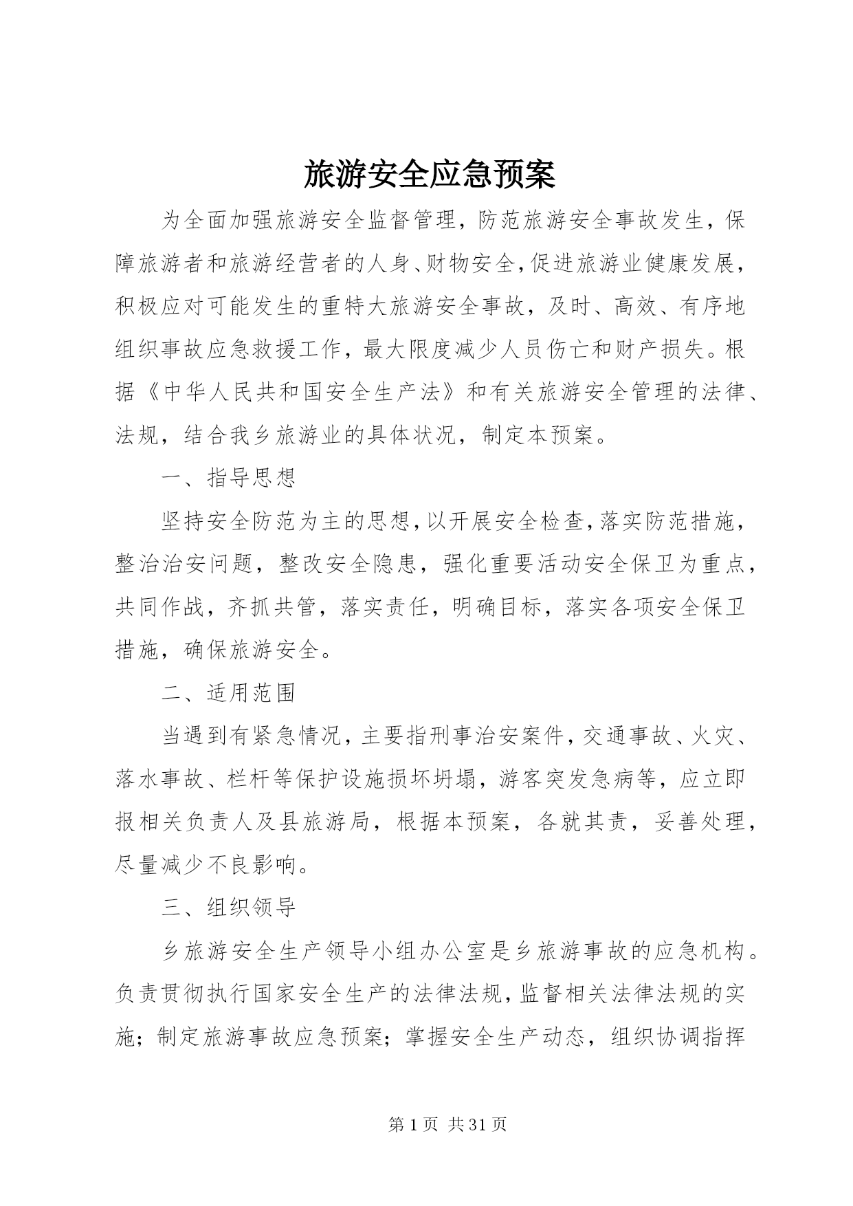 第PAGE\*Arabic\*MERGEFORMAT31页共NUMPAGES\*MERGEFORMAT31页旅游安全应急预案为全面加强旅游安全监督管理,防范旅游安全事故发生,保障旅游者和旅游经营者的人身、财物安全,促进旅游业健康发展,积极应对可能发生的重特大旅游安全事故,及时、高效、有序地组织事故应急救援工作,最大限度减少人员伤亡和财产损失。根据《中华人民共和国安全生产法》和有关旅游安全管理的法律、法规,结合我乡旅游业的具体状况,制定本预案。一、指导思想坚持安全防范为主的思想,以开展安全检查,