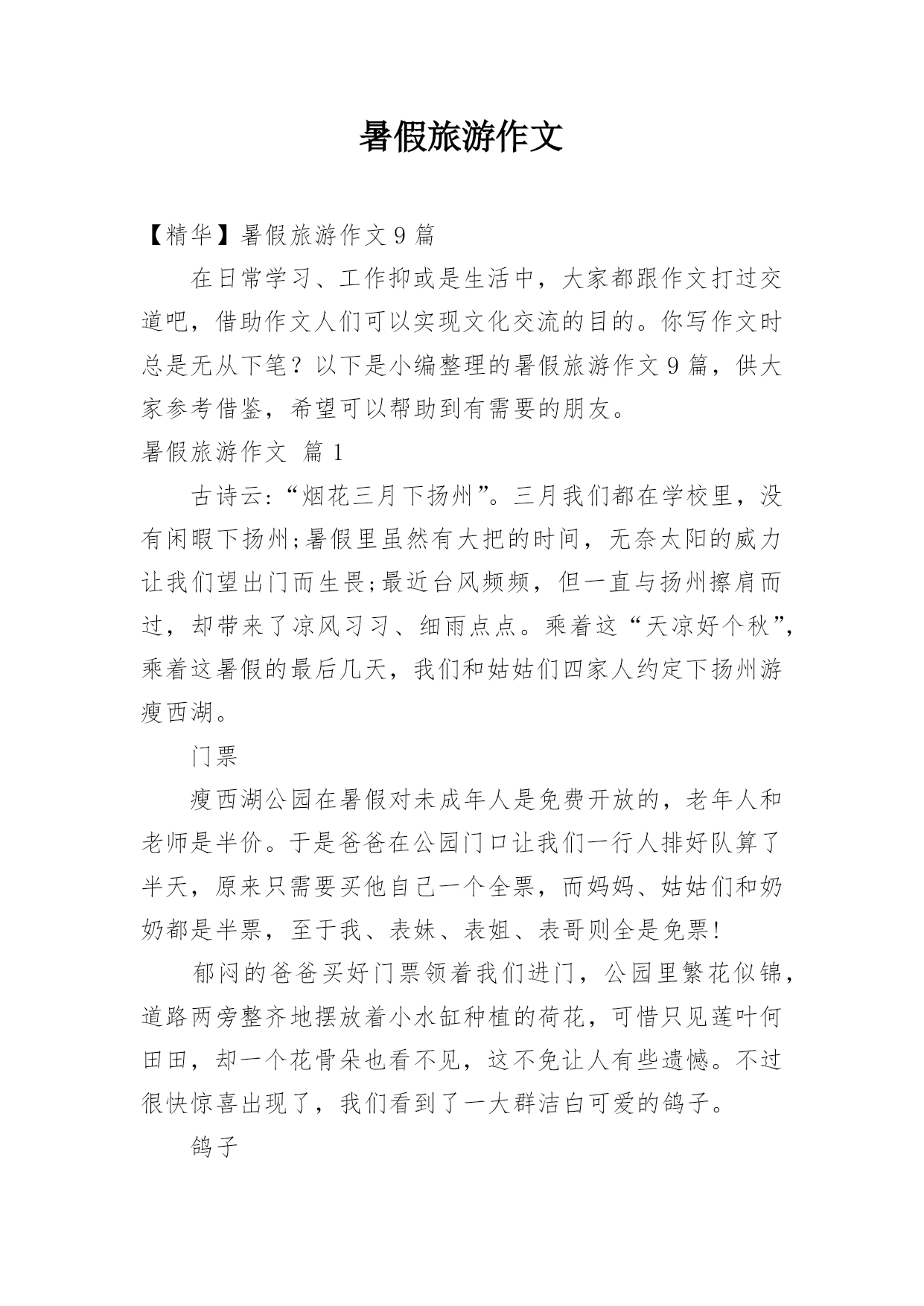 暑假旅游作文【精华】暑假旅游作文9篇在日常学习、工作抑或是生活中,大家都跟作文打过交道吧,借助作文人们可以实现文化交流的目的。你写作文时总是无从下笔?以下是小编整理的暑假旅游作文9篇,供大家参考借鉴,希望可以帮助到有需要的朋友。暑假旅游作文篇1古诗云:“烟花三月下扬州”。三月我们都在学校里,没有闲暇下扬州;暑假里虽然有大把的时间,无奈太阳的威力让我们望出门而生畏;最近台风频频,但一直与扬州擦肩而过,却带来了凉风习习、细雨点点。乘着这“天凉好个秋”,乘着这暑假的最后几天,我们和姑姑们四家人约定下扬州游瘦西湖