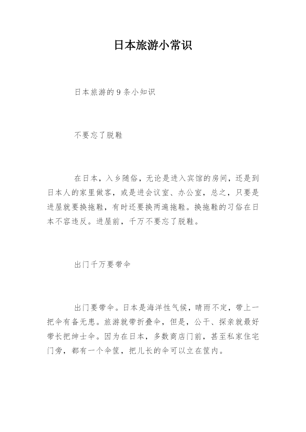 日本旅游小常识日本旅游的9条小知识不要忘了脱鞋在日本,入乡随俗,无论是进入宾馆的房间,还是到日本人的家里做客,或是进会议室、办公室,总之,只要是进屋就要换拖鞋,有时还要换两遍拖鞋。换拖鞋的习俗在日本不容违反。进屋前,千万不要忘了脱鞋。出门千万要带伞出门要带伞。日本是海洋性气候,晴雨不定,带上一把伞有备无患。旅游就带折叠伞,但是,公干、探亲就最好带长把绅士伞。因为在日本,多数商店门前,甚至私家住宅门旁,都有一个伞筐,把儿长的伞可以立在筐内。花钱不用给小费日本和许多亚洲国家一样,没有给小费的习惯。因为大饭店、
