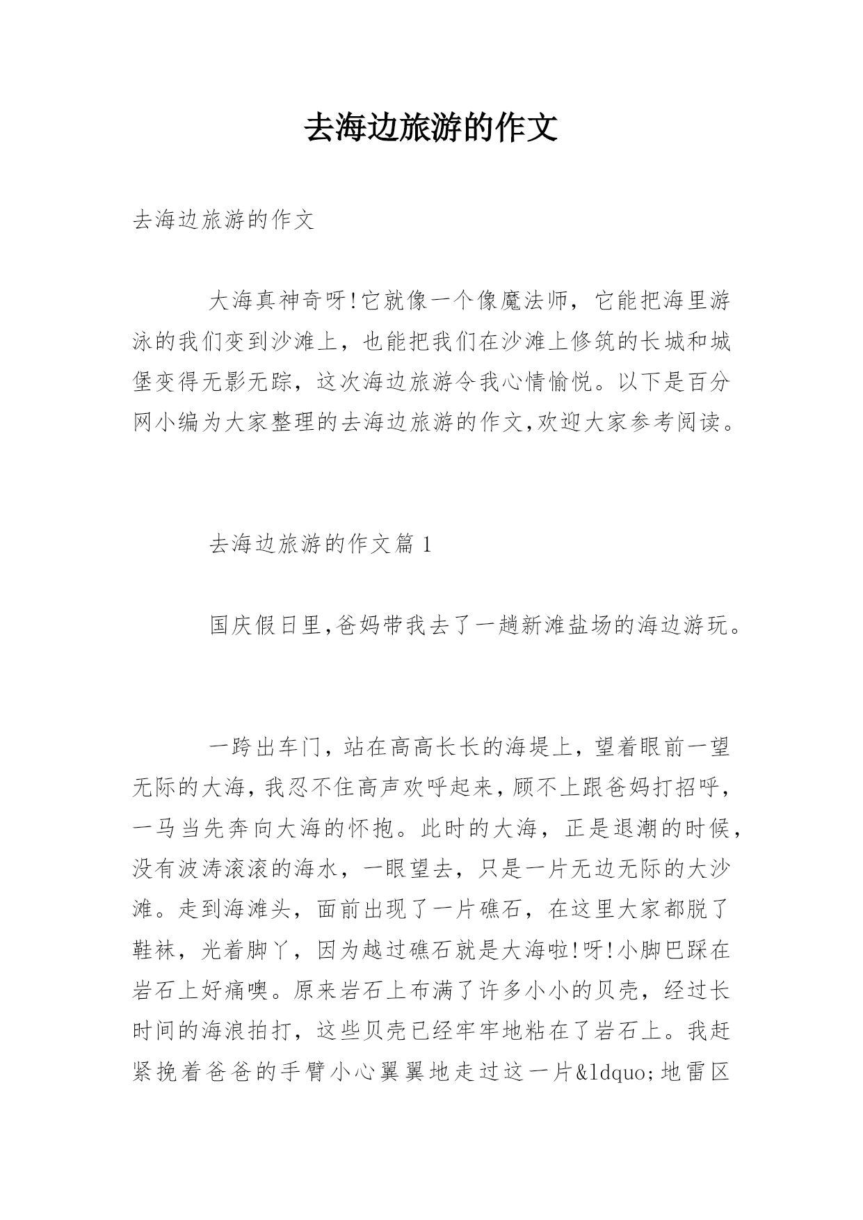 去海边旅游的作文去海边旅游的作文大海真神奇呀!它就像一个像魔法师,它能把海里游泳的我们变到沙滩上,也能把我们在沙滩上修筑的长城和城堡变得无影无踪,这次海边旅游令我心情愉悦。以下是百分网小编为大家整理的去海边旅游的作文,欢迎大家参考阅读。去海边旅游的作文篇1国庆假日里,爸妈带我去了一趟新滩盐场的海边游玩。一跨出车门,站在高高长长的海堤上,望着眼前一望无际的大海,我忍不住高声欢呼起来,顾不上跟爸妈打招呼,一马当先奔向大海的怀抱。此时的大海,正是退潮的时候,没有波涛滚滚的海水,一眼望去,只是一片无边无际的大沙滩