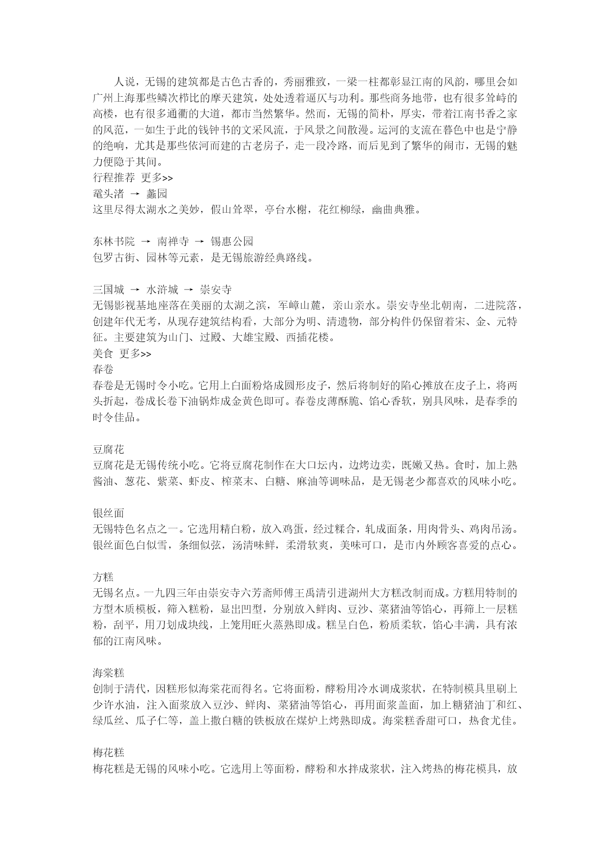 人说,无锡的建筑都是古色古香的,秀丽雅致,一梁一柱都彰显江南的风韵,哪里会如广州上海那些鳞次栉比的摩天建筑,处处透着逼仄与功利。那些商务地带,也有很多耸峙的高楼,也有很多通衢的大道,都市当然繁华。然而,无锡的简朴,厚实,带着江南书香之家的风范,一如生于此的钱钟书的文采风流,于风景之间散漫。运河的支流在暮色中也是宁静的绝响,尤其是那些依河而建的古老房子,走一段冷路,而后见到了繁华的闹市,无锡的魅力便隐于其间。行程推荐更多>>鼋头渚→蠡园这里尽得太湖水之美妙,假山耸翠,亭台水榭,花红柳绿,幽曲典雅。东林书院→