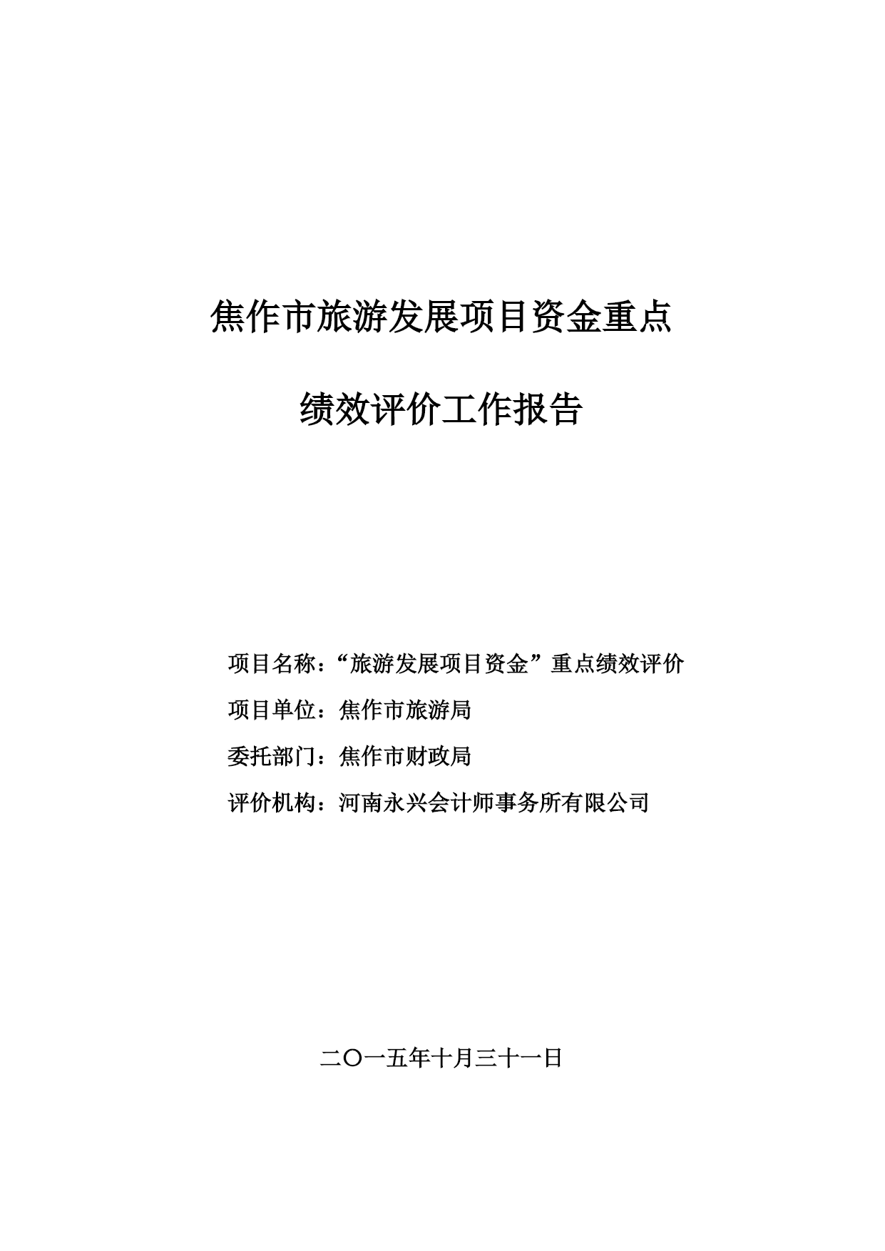 焦作市旅游发展项目资金重点绩效评价工作报告项目名称:“旅游发展项目资金”重点绩效评价项目单位:焦作市旅游局委托部门:焦作市财政局评价机构:河南永兴会计师事务所有限公司二〇一五年十月三十一日编号:时间:2021年x月x日书山有路勤为径,学海无涯苦作舟页码:第PAGE68页共NUMPAGES69页第PAGE\*MERGEFORMAT68页共NUMPAGES\*MERGEFORMAT69页焦作市旅游发展项目资金重点绩效评价工作报告第一部分项目概况一、项目立项背景和目的当前,旅游已成为全球