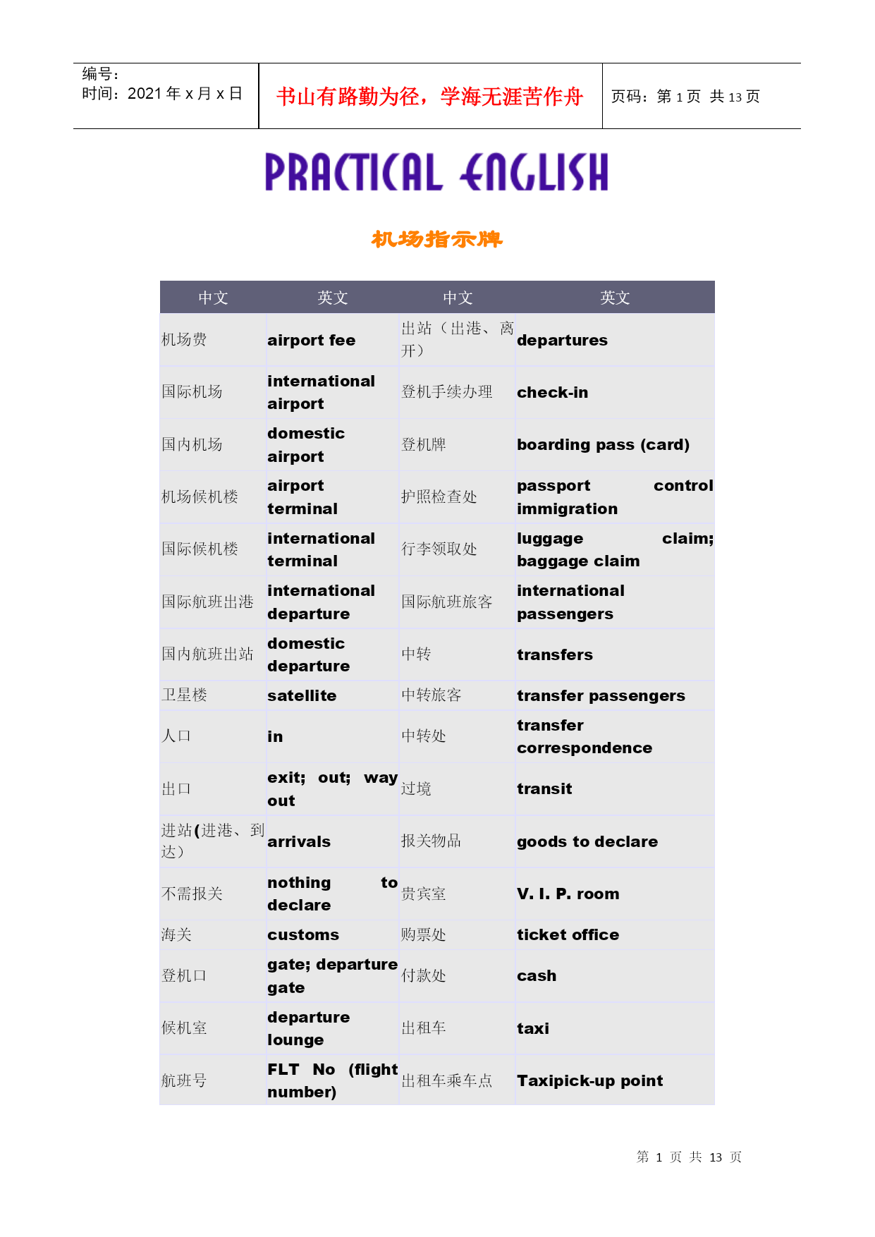 编号:时间:2021年x月x日书山有路勤为径,学海无涯苦作舟页码:第PAGE13页共NUMPAGES13页第PAGE\*MERGEFORMAT13页共NUMPAGES\*MERGEFORMAT13页机场指示牌中文英文中文英文机场费airportfee出站(出港、离开)departures国际机场internationalairport登机手续办理check-in国内机场domesticairport登机牌boardingpass(card)机场候机楼airportterminal护