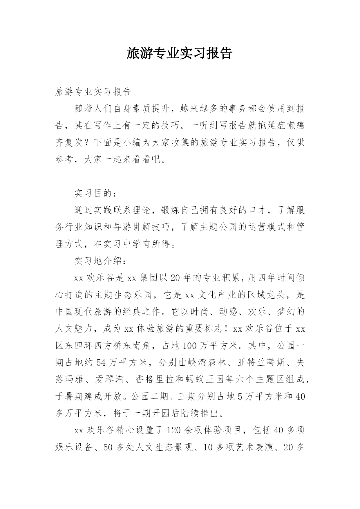 旅游专业实习报告旅游专业实习报告随着人们自身素质提升,越来越多的事务都会使用到报告,其在写作上有一定的技巧。一听到写报告就拖延症懒癌齐复发?下面是小编为大家收集的旅游专业实习报告,仅供参考,大家一起来看看吧。实习目的:通过实践联系理论,锻炼自己拥有良好的口才,了解服务行业知识和导游讲解技巧,了解主题公园的运营模式和管理方式,在实习中学有所得。实习地介绍:xx欢乐谷是xx集团以20年的专业积累,用四年时间倾心打造的主题生态乐园,它是xx文化产业的区域龙头,是中国现代旅游的经典之作。它以时尚、动感、欢乐、梦幻